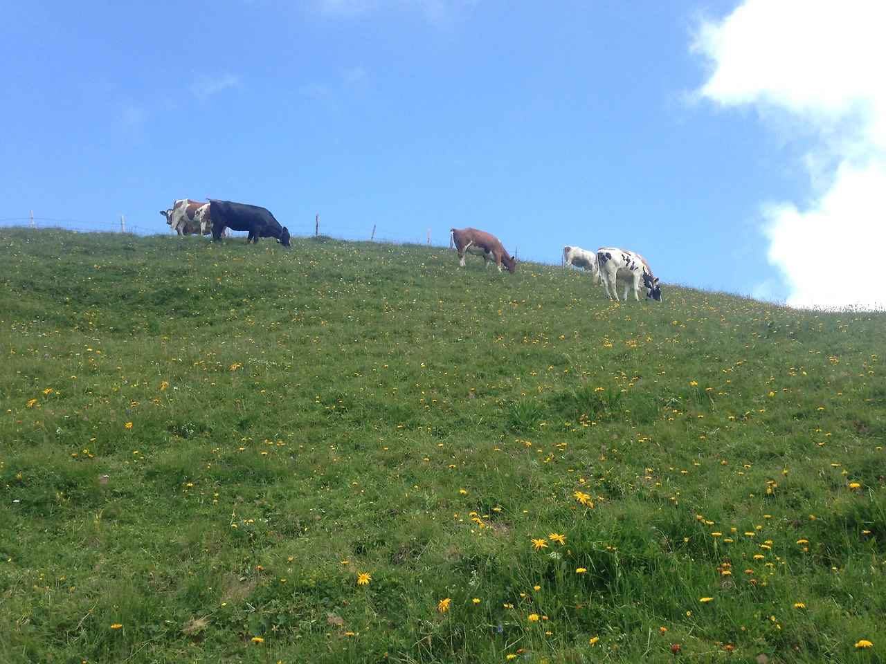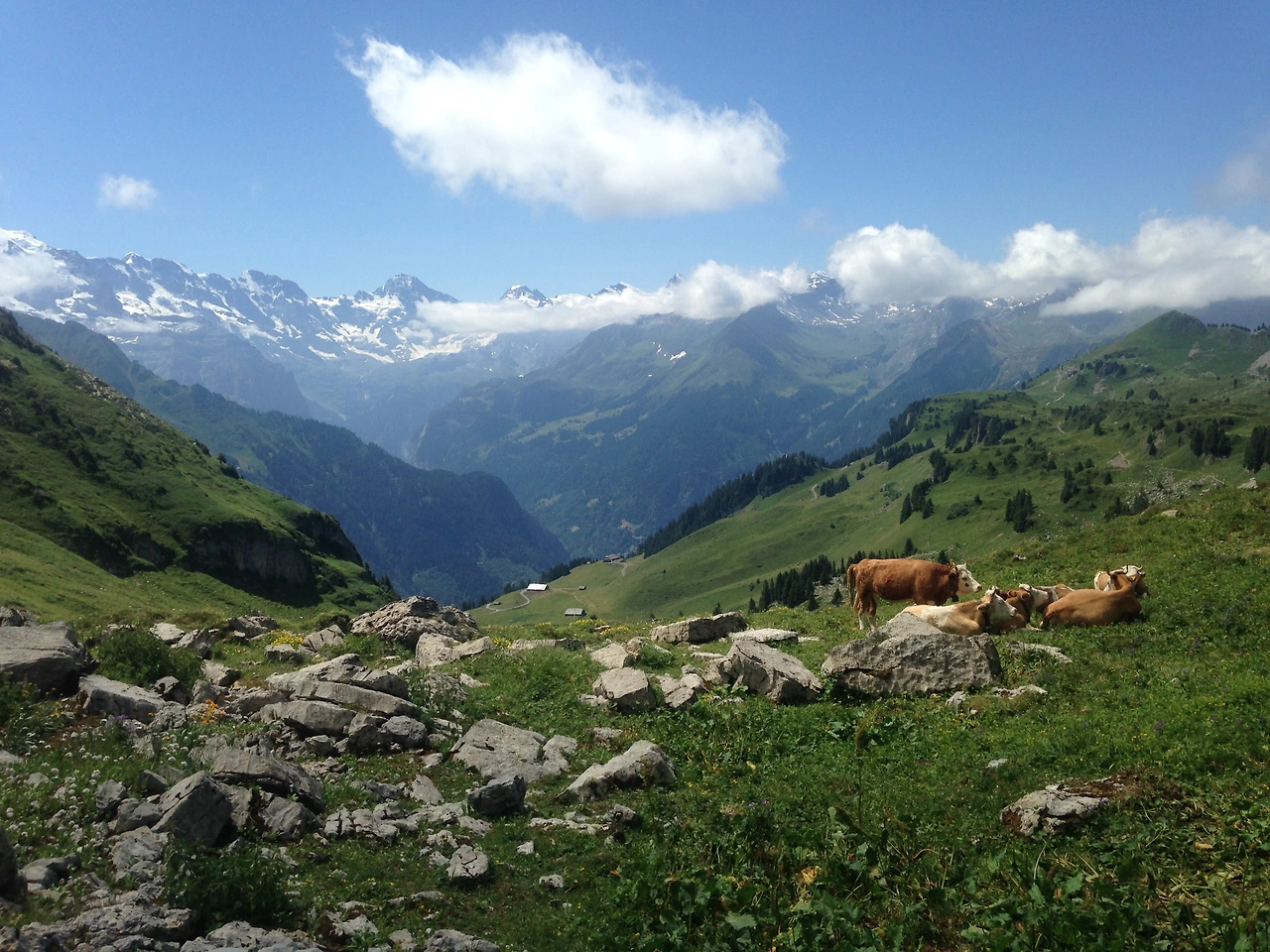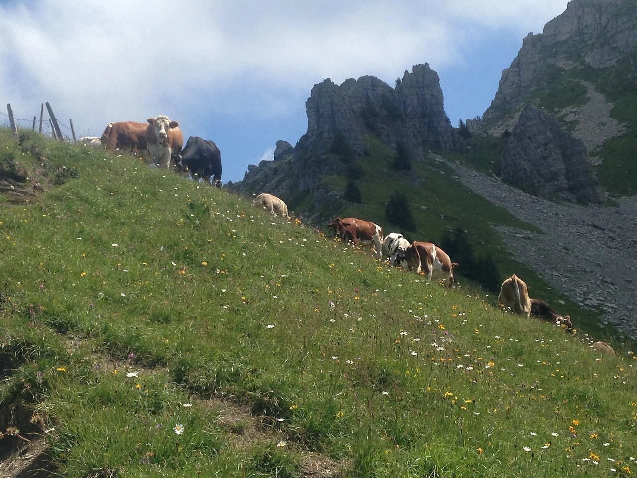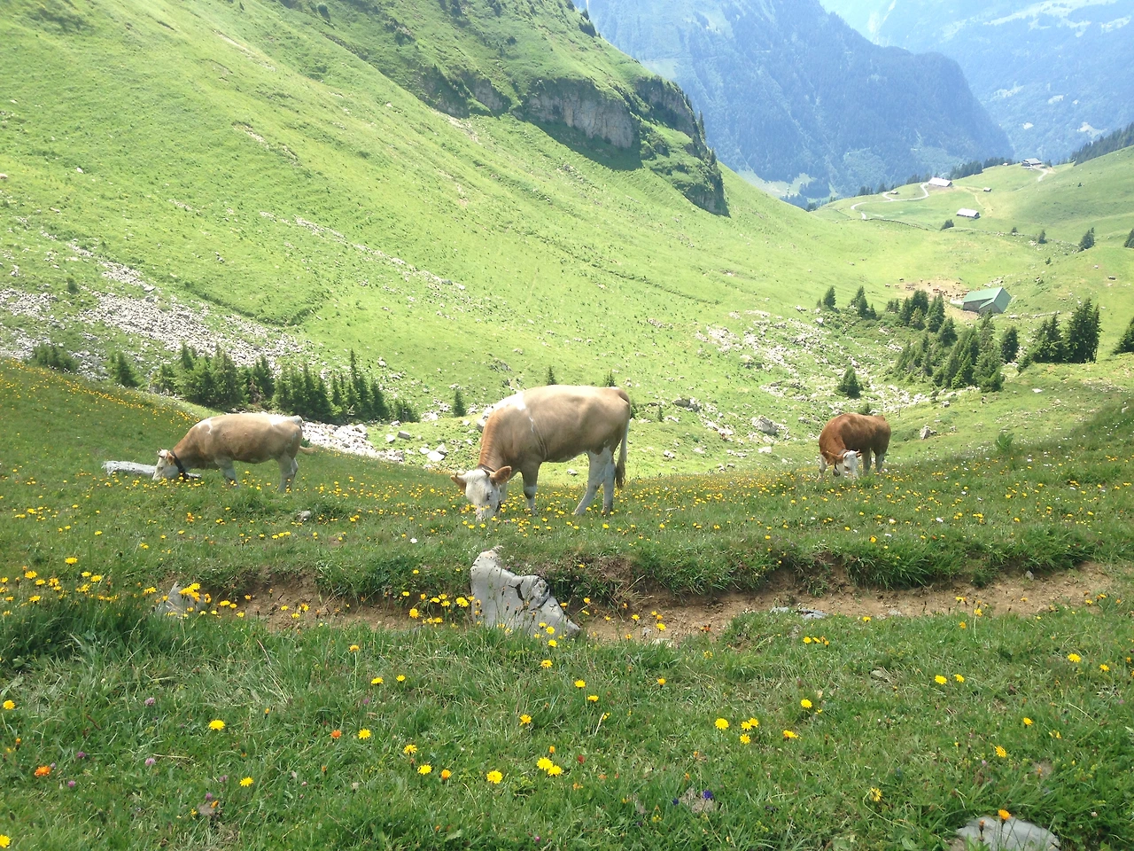 호수 풍경을 지나면 자유롭게 풀을 뜯고 있는 소들을 만날 수 있다. 스위스에서 보니 소마저도 여유롭게 보였다. 친근함을 표현했던 우리에게 별로 거부감이 없었는지 한 마리가 계속 쫓아와서 걸음을 재촉해 겨우 떼어냈다