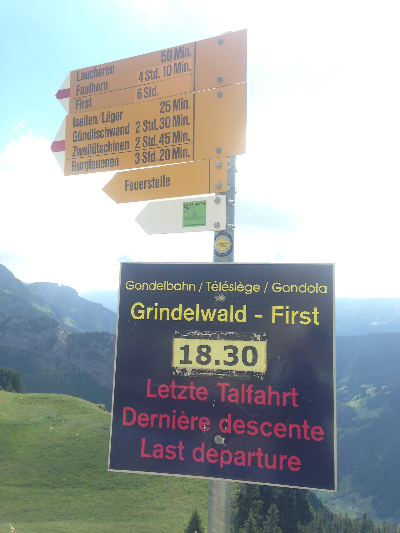 경치를 감상한 후 하이킹 지점으로 이동하니 피르스트까지 하이킹을 하는 사람들을 위해 피르스트에서 마지막 케이블카 출발시간이 표시되어 있다. 하이킹을 하고자 하는 사람들은 마지막 케이블카 시간도 고려해야 한다.
