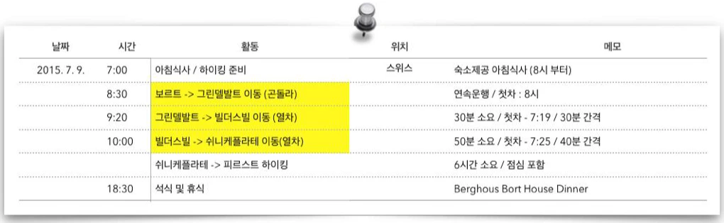 가깝기만 하다면야 제주도 올레길처럼 1번부터 쭉 하이킹을 시작하는 것도 나쁘지 않겠지만.. 올레길도 다 돌아보지 못한 마당에 올레길보다 훨씬 많은 그것도 타지에서의 하이킹 코스를 선택하는 것이 쉽지만은 않았다. 고심 끝에 정말 놓치기 싫은 하이킹 코스 몇 개를 정하고 날씨 상황에 따라 일정을 조정하기로 했다. 그리고 아쉬움이 남는 코스는 다음번에 다시 한 번 스위스를 방문하는 것으로 아쉬움을 달랬다.