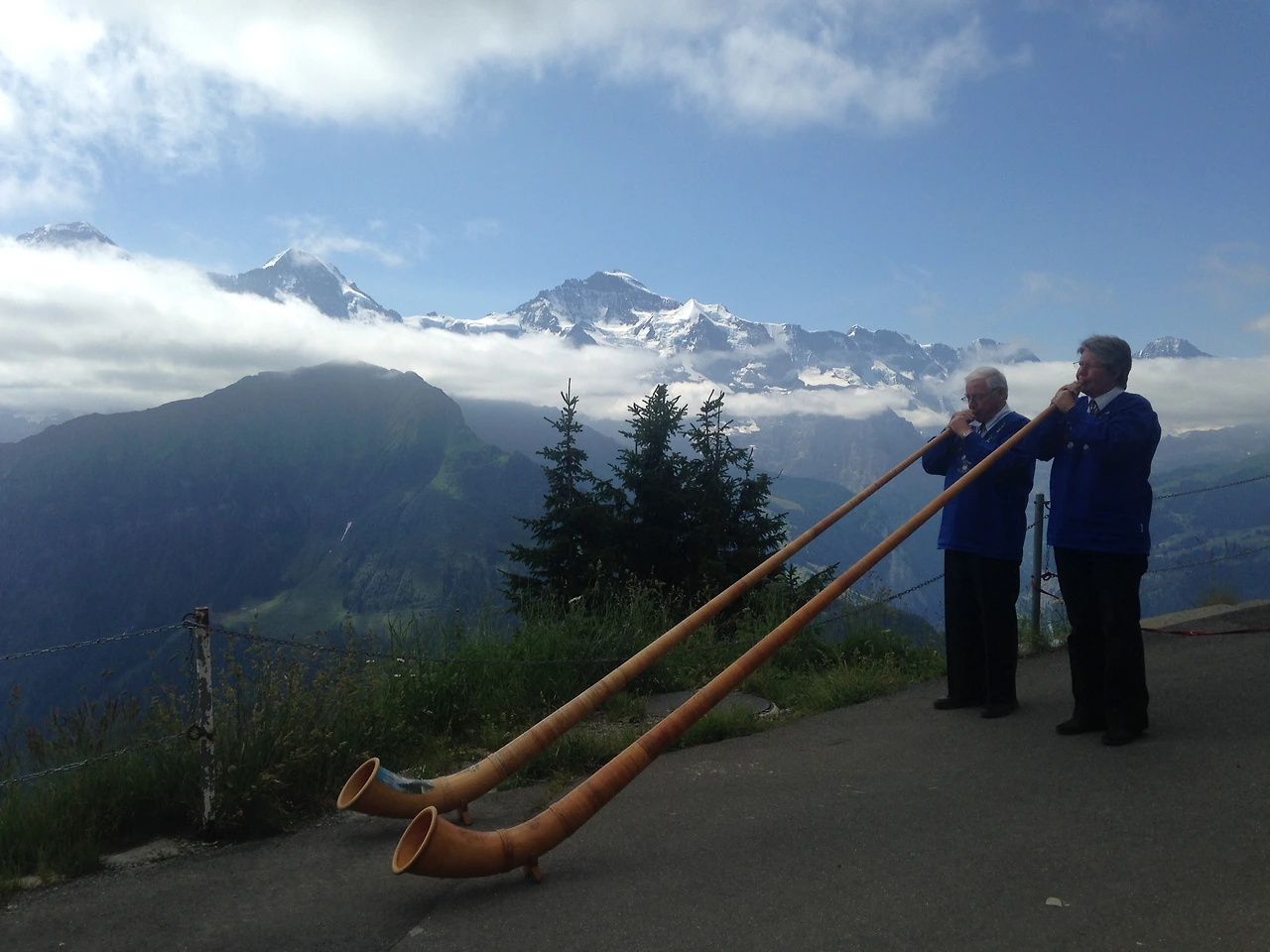 역에서 가까운 곳에 위치한 호텔 직원들이 스위스 전통 악기를 들고 관광객들에게 퍼포먼스를 하고 있었다. 이 역시 멋진 풍경과 함께 하니 아주 멋진 그림이 되었다.