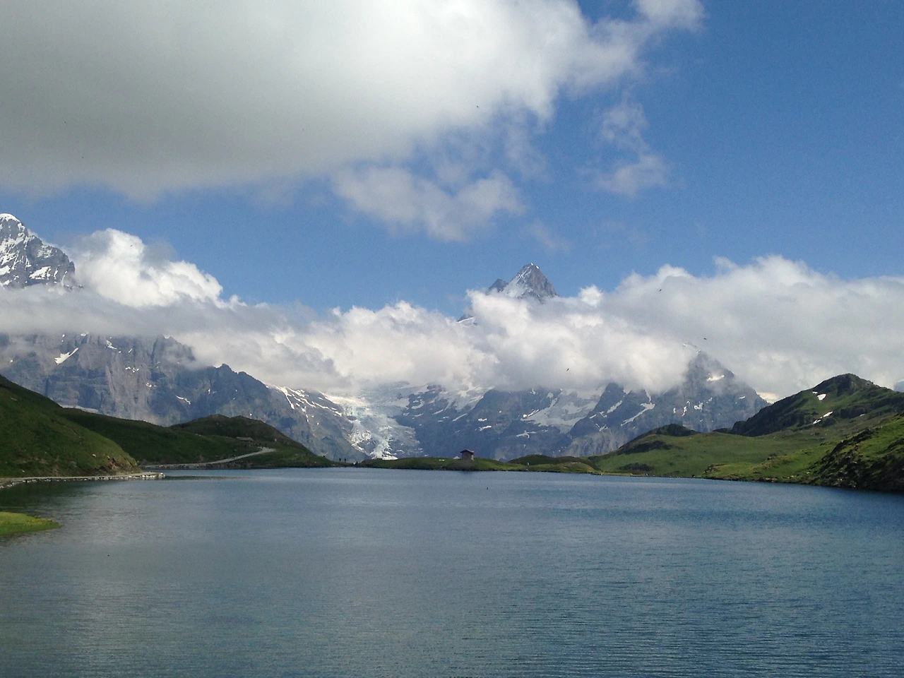 하이킹을 시작한 지 약 5시간이 지나자 유명한 바흐알프제 호수가 나타났다. 호수 뒤쪽으로 나타나는 설산이 호수와 어울려 멋진 경치를 뿜어내고 있었다. 스위스 관광안내서에 단골로 등장하는 풍경이다. 우리도 이곳에서 한동안 경치를 감상하며 휴식을 취했다. 구름이 걷히길 한참을 기다렸지만 결국 구름을 걷어내지는 못했다.