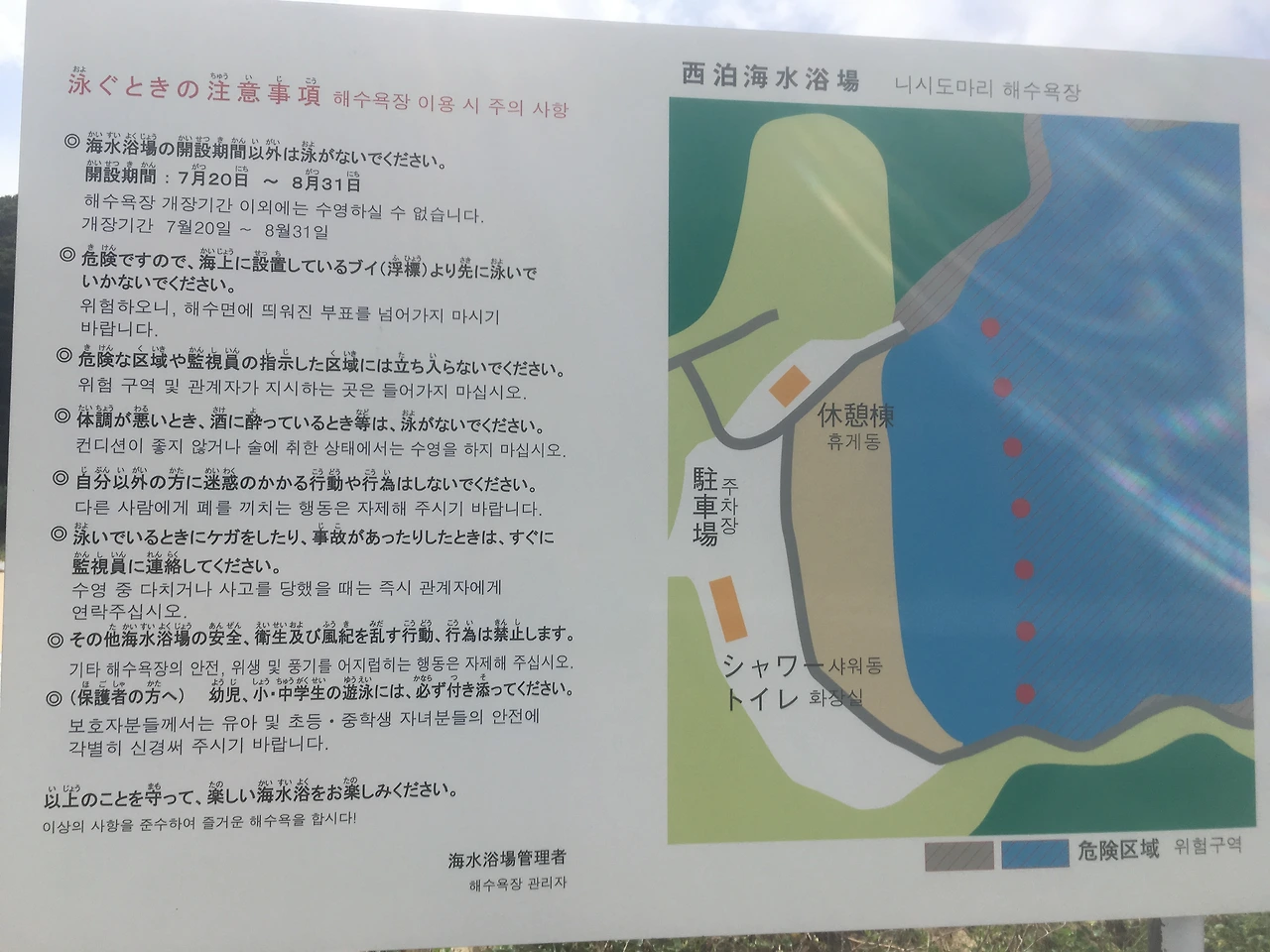 니시도마리 해수욕장은 미우다 해수욕장과 인접해 있고 규모도 비슷해 보였지만 관광안내서 등엔 전혀 소개되어 있지 않아 계획에 없던 곳이었는데, 온천으로 이동하던 중 구글 지도와 도로 표지판에서 해수욕장을 발견하고는 호기심에 가보게 된 곳이다. 해수욕장의 이름도 안내표지판을 보고서야 알았다.