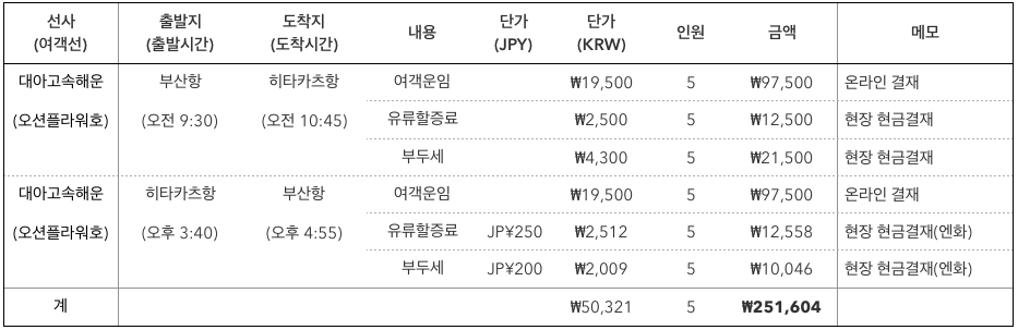 우린 여객선사 홈페이지를 일일이 확인하다가 대아고속해운에서 대폭 할인된 특가를 발견해 얼른 예약했다. 정상 가격 대비 50% 이상 할인된 가격이어서 여행비용을 절감하는데 큰 성과였다.