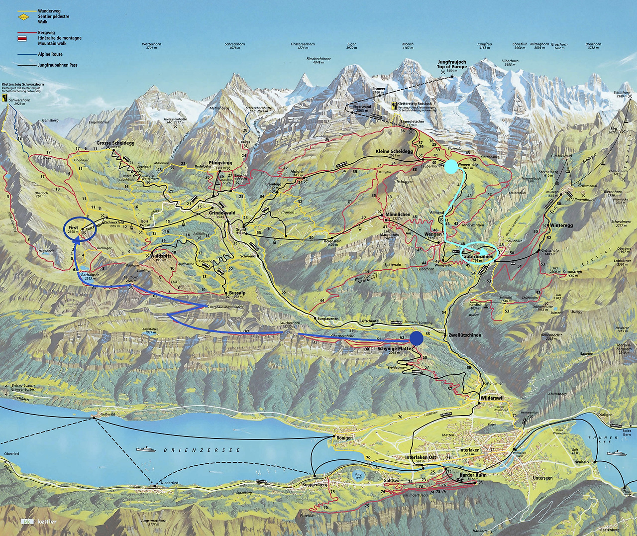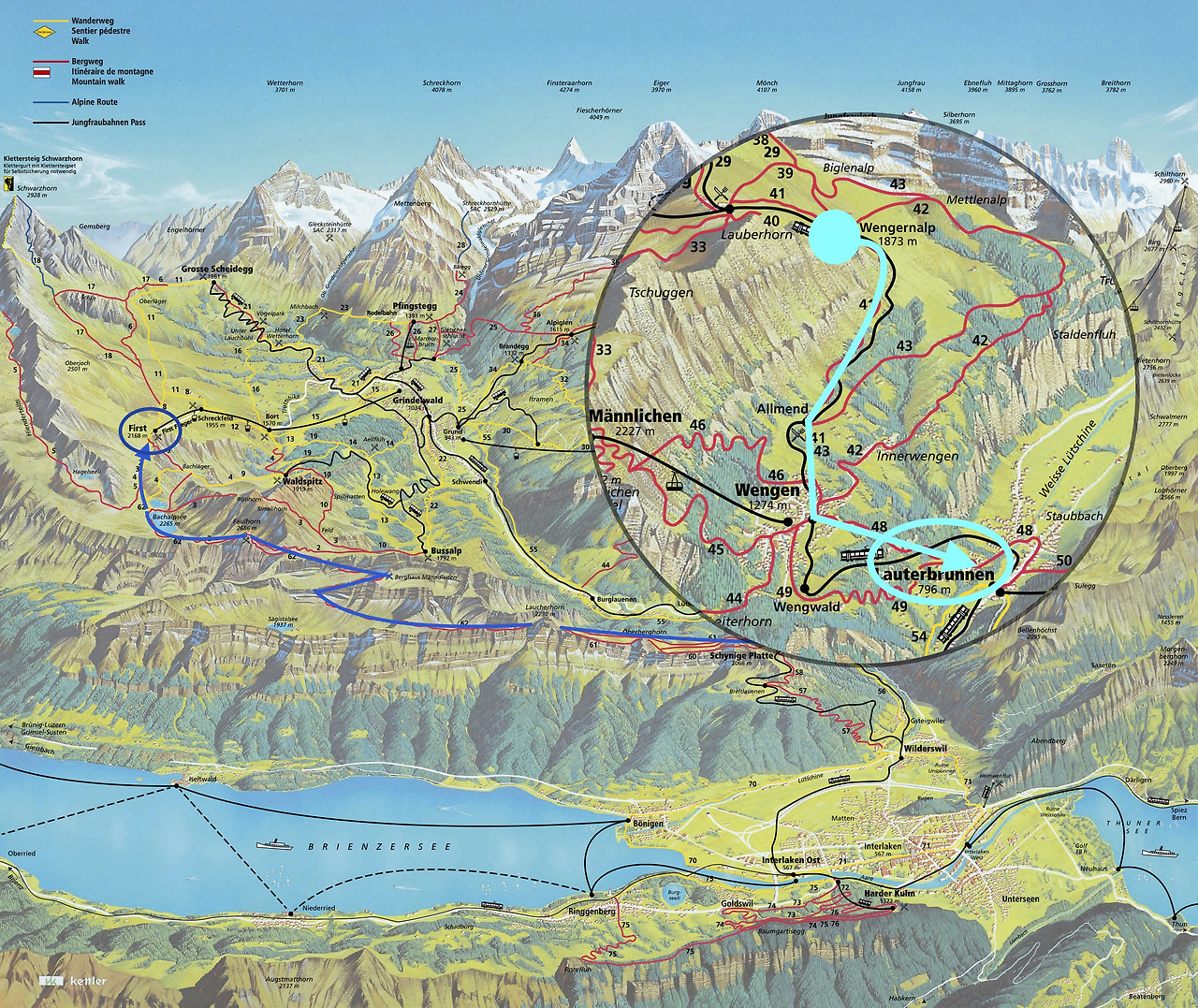 융프라우에서의 마지막 하이킹 코스는 벵앤과 라우터브루넨 지역을 택했다. 벵엔 알프에서 벵엔을 거쳐 라우터브루넨까지 연결되는 루트이다.(아래 지도의 하늘색 코스)