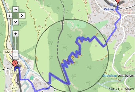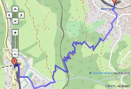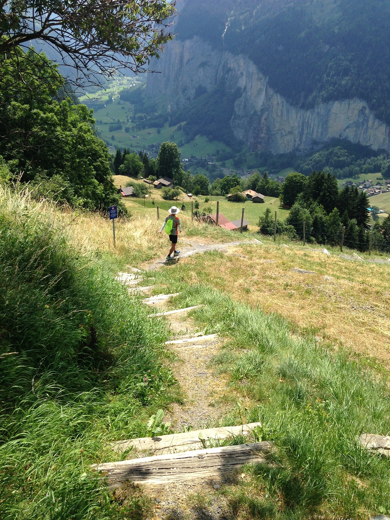하이킹 초입에서 보면 라우터브루넨이 마치 눈앞에 있는 듯 가까이 보여 금방 갈 수 있을 것 같았지만 500m 고도차를 내려와야 하기 때문에 완만한 지그재그 숲길을 계속 걸어가야 한다. 길 초입에서 만난 경치는 숲길에 들어서면서 나무에 가려져 사라지고 숲길을 벗어나 라우터브루넨에 거의 도착할 즈음 다시 나타난다. 그래서 조금 걷다 보면 지루할 수도 있다.