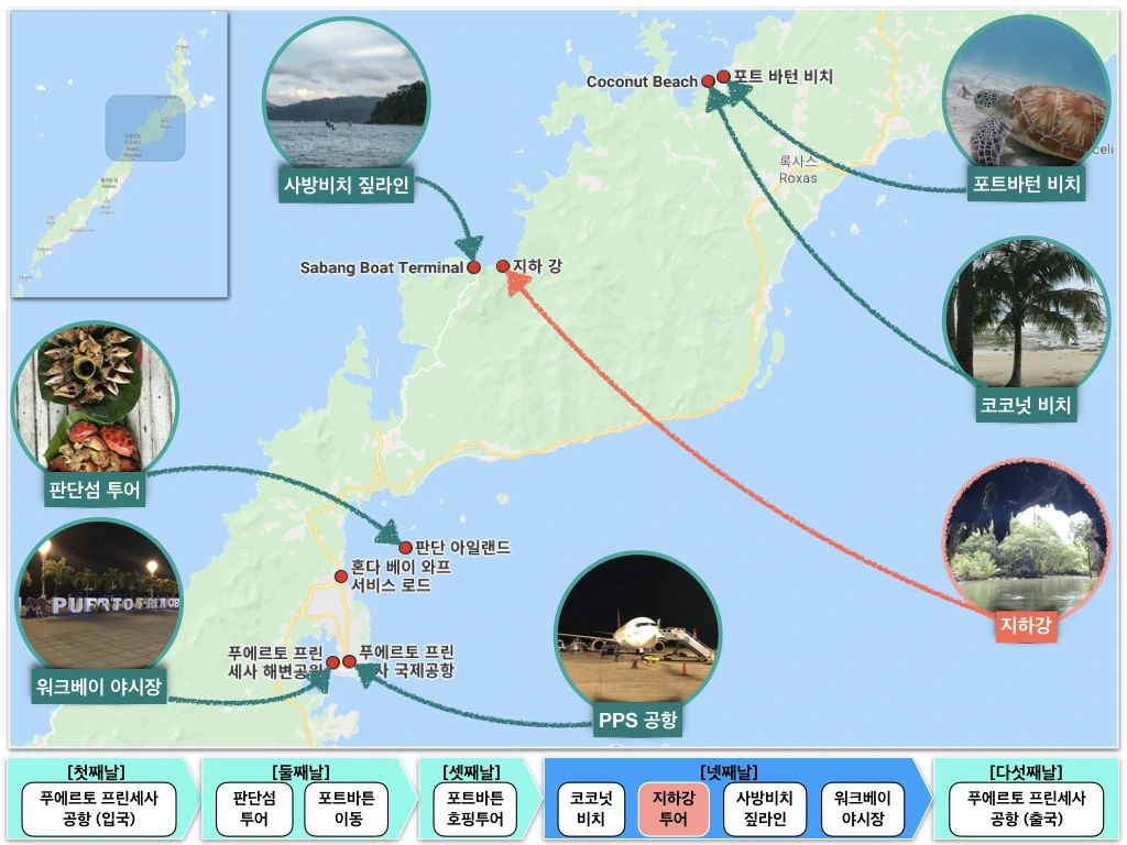 포트바튼에서 지하강 투어 장소인 사방비치까지는 약 3시간 정도가 소요된다. 원래 계획대로라면 대기시간을 고려해서 오전에 도착해야 했지만 출발이 늦어진 탓에 점심때가 조금 지난 시간에 도착했다.