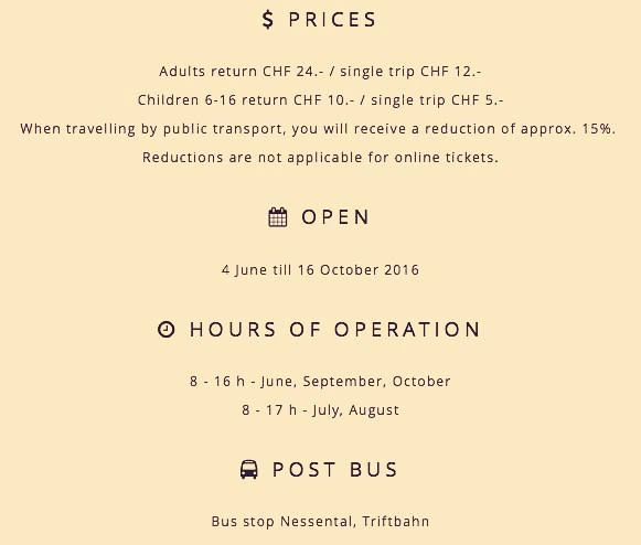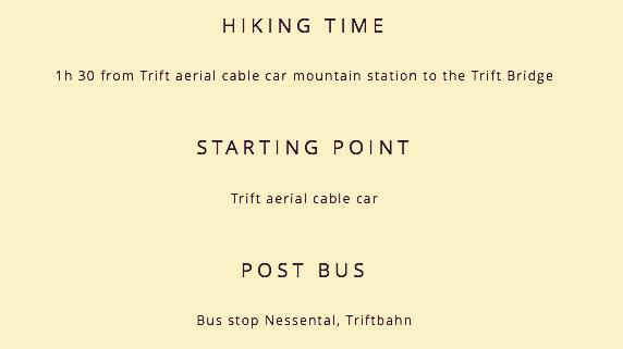 트리프트 다리 하이킹을 위해서는 트리프트 케이블카에 대한 정보도 사전에 확인해야 한다. 케이블카 예약은 온라인에서도 가능하며 오프라인은 'Innertkrichen'에 위치한 'Grimseltor Tourist Center'와 케이블카 탑승장에서 티켓 구매가 가능하다. 만약 대중교통을 이용할 경우 15% 할인이 되는데 이는 오프라인에서만 적용된다고 되어 있다. 트리프트 케이블카를 타려면 버스를 이용해야 하는데 SBB(스위스 철도청) 사이트에서 도착지에 "Nessental, Triftbahn"으로 검색하면 대중교통 정보를 확인할 수 있다.