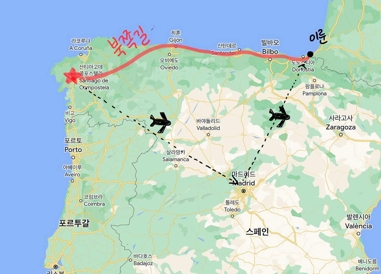 은의 길을 마치고, 바로 다음날 북쪽길의 시작점 이룬으로 향한다. 오늘 하루는 종일 이동하는 여정이다. 산티아고데콤포스텔라 공항에서 출발해서 -> 마드리드를 경유하고 -> 산세바스티안 공항에 도착해 -> 이룬으로 도보 이동하는 코스다.