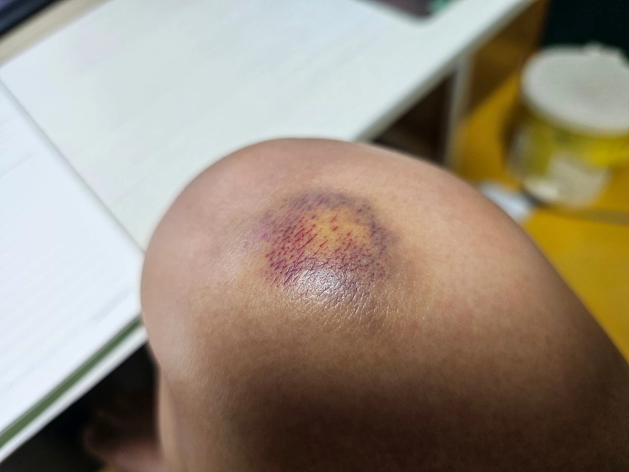 멍이 낫고 있나? 멍이 들었던 무릎의 멍 색깔이 다채로워지고 있다.... 이제 원래의 살결로 회복하기 직전이란 신호겠지..