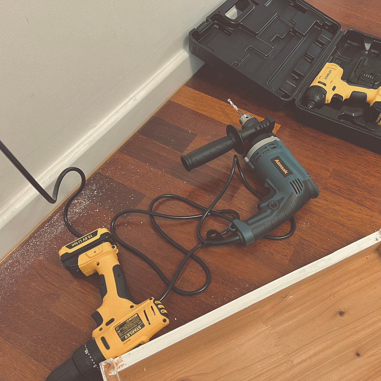 도배 마감 때문에 벽체가 석고보드로 덧대져 있었는데 보드가 너무 약했다는 사실에 1차 쇼크. 석고보드가 쏟아내는 비산먼지에 2차 쇼크. 목표 위치 아래에 비닐을 붙이면 가루가 그곳으로 얌전히 다 들어갈 거라는 가설은 완벽히 빗나가 석고가루는 온 사방에 5월의 크리스마스처럼 날렸다. 창문을 열어뒀지만 소용이 없어 곧바로 94 마스크를 장착했다. 유선 드릴의 전원까지 켠 상태에서 콘크리트층까지 진입해야 할지 살짝 고민하다가 합판 두께로 미뤄볼 때 받침대 무게 정도는 버텨볼 수 있다고 판단했다. 사실 콘크리트층을 뚫으면 나올 시멘트 가루 뒤처리가 귀찮았고, 해머 드릴의 진동은 아무리 낮이라도 층간 소음이 될 수 있다. 반쯤은 진심으로 3M 방진 마스크가 필요한 게 아닌가 하는 쓸데없는 걱정 때문에라도 정신 건강을 위해 빠르게 포기해 버렸다.