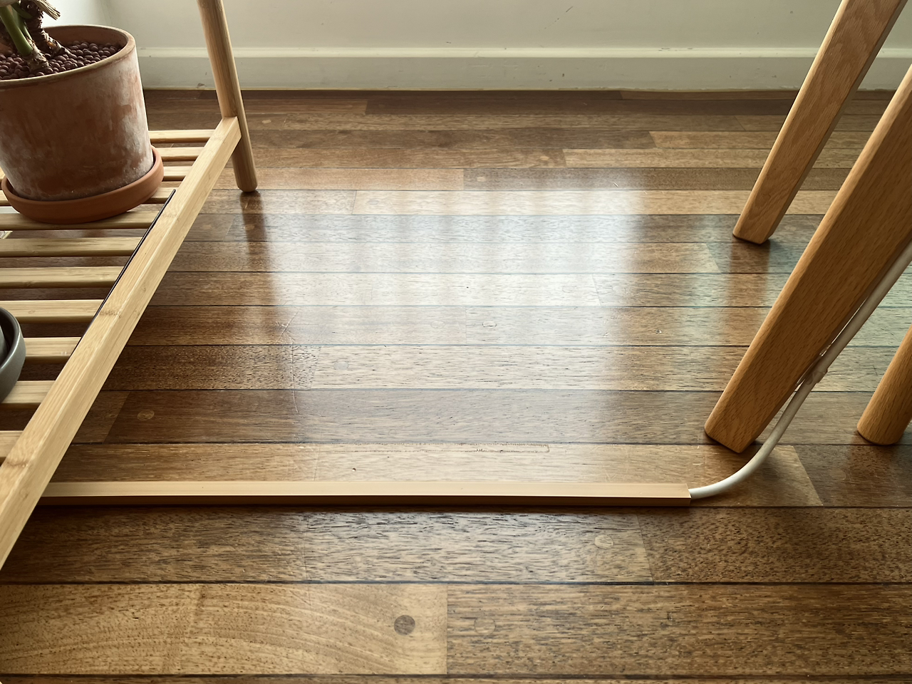 집의 바닥재는 방과 거실, 주방까지 모두 같은 종류인데 확신할 수는 없지만 멀바우(Merbau) 원목으로 추정된다. 왜 추정이냐 하면, 내가 아는 멀바우는 색이 진하고 살짝 붉은 끼가 돌며 시간이 지날수록 점점 더 진해진다고 알고 있어서인데 우리집의 경우는 좀 다르기 때문이다. 통창을 통해 빛에 가장 오래 노출되는 거실 마루는 해가 깊게 들어오는 딱 그 부분까지 노랗게 빛이 바랬다. 전체적으로는 너도밤나무 목재와 비슷한 색으로 보이고, 심지어 어떤 패널은 대나무인가 싶을 정도로 밝아 보이기도 한다. 가장 밝은 창가부터 어두운 복도까지 마룻바닥의 색이 점점 짙어지는 그레디언트 현상을 볼 수 있다. 거실과 달리 해가 들지 않는 현관 복도와 북향인 서재는 내가 아는 멀바우의 찐하고 붉은 끼 도는 바로 그 색 그대로다. 뚜렷한 경계 없이도 거실과 복도, 방의 바닥은 질감은 같지만 색상에서 확연히 차이가 난다.
