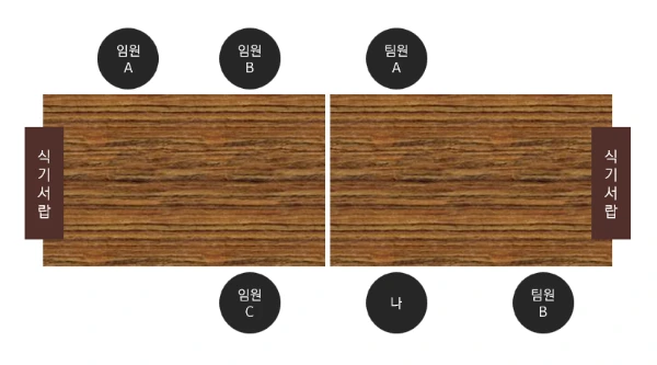얼마 전, 회사 임원진과의 간단한 회식이 있었다. 자리에 있었던 인원은 총 6명이었는데, 식당에 들어선 순서대로 4인용 테이블 두 개가 붙어진 자리에 앉다 보니 임원 셋과 우리 팀 직원 셋으로 나뉘어 앉게 되었다. 앉는 순간 '아차' 싶었다. 저쪽 테이블에서 식사잡무*를 할 사람이 없다. 두 테이블은 약간의 틈도 없이 딱 붙어있는 테이블이긴 했지만, 뭘 하든 팔이 멀었다. 사실 숟가락 정도는 가까운 사람이 알아서 놓으면 될 일인데, 그 찰나에 이런 눈치를 보며 불편한 내가, 불편했다.