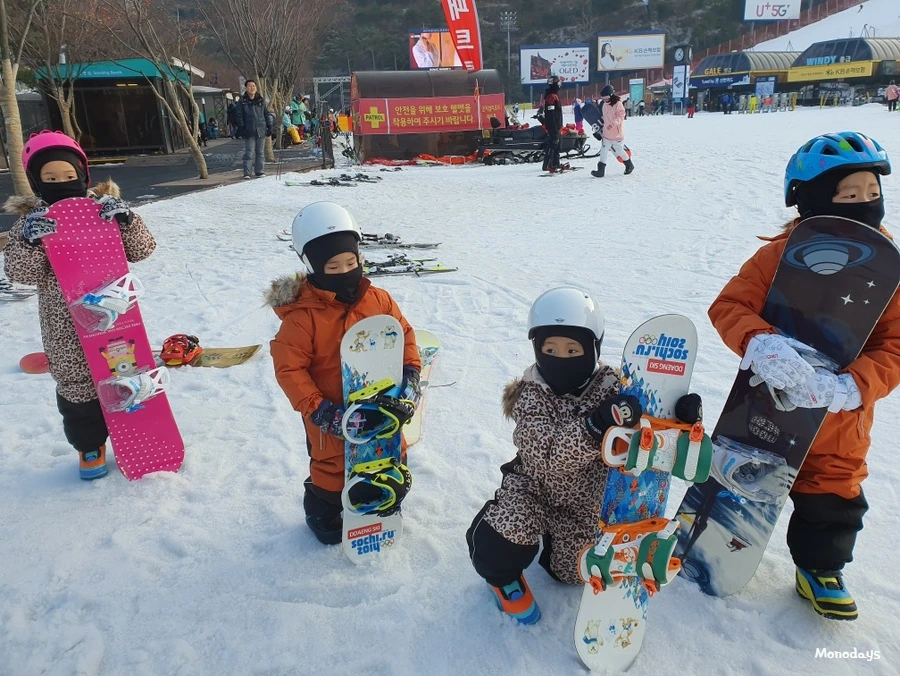 그때 마침, 제주도에 사는 친한 친구한테서 연락이 왔다. "애들 스키나 보드 강습시키고 싶은데, 같이 하자!" 어렸을 때부터 서울과 제주를 오가며 같이 자주 놀러 다녔던지라 왠지 같이하면 애들도 서로 의지하면서 잘 할 것 같은 마음에 흔쾌히 오케이!를 하고 강습을 알아보는데, 계산해 보니 강습비가 1인당 백만 원 정도 드는 게 아닌가. 아, 이 돈이면 차라리 직접 가르쳐주고 더 자주 스키장을 가는 게 낫겠다 생각이 들어서 친구와 함께 남편을 꼬시기 시작했다. 결국 우리의 꼬임에 넘어간 남편이 애들 넷을 가르치기로 결심을 했다.