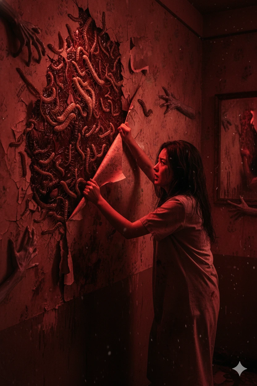 절망에 찬 소연 씨는 소리가 들려오는 벽으로 향했습니다. 손이 떨렸지만, 그녀는 들뜬 벽지 가장자리를 움켜쥐었습니다. 그 아래에는 콘크리트도, 벽돌도 없었습니다. 그 아래에는 축축하고 맥동하는 덩어리가 고동치고 있었습니다.