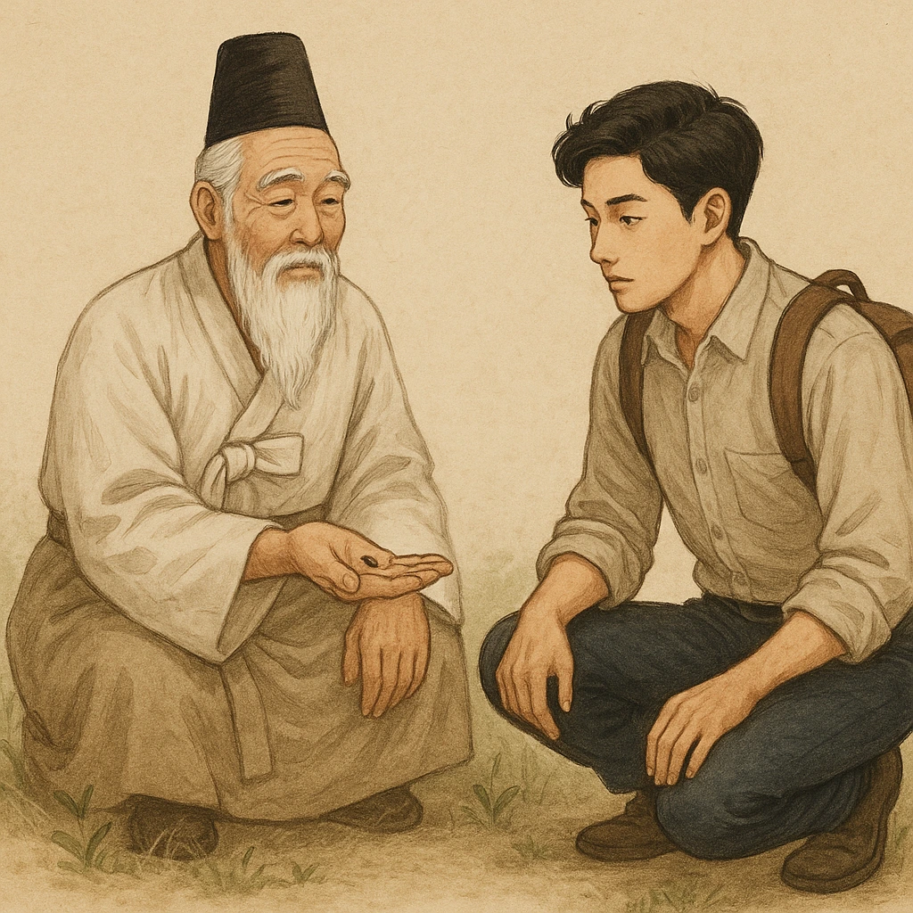 젊은이는 씨앗을 손에 꼭 쥐고 한참 동안 생각에 잠겼어. 그의 마음속에도 작고 보이지 않던 씨앗 하나가 심긴 것처럼, 뭔가 따뜻한 깨달음이 스며들었어. 그때부터 그는 작은 것의 소중함과 보이지 않는 잠재력에 대해 깊이 사유하게 되었단다.