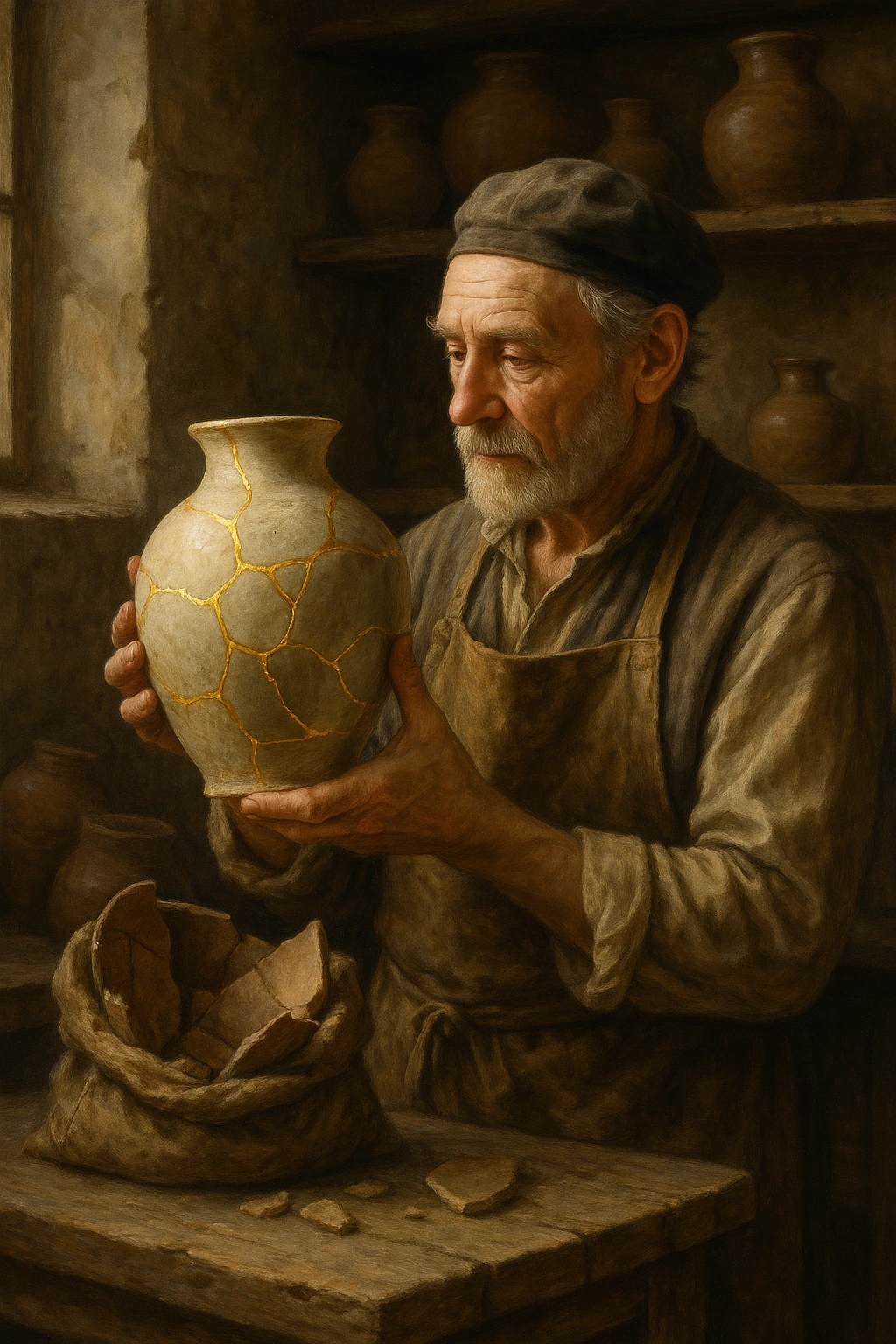 하지만 이번에는 예전처럼 원래대로 맞추려 하지 않았다. 그는 옛 물건들을 고칠 때 사용하는 금빛 옻칠을 꺼내 조각들을 붙이기 시작했다. 모든 이음새를 감추지 않고 오히려 더 돋보이게 반짝이도록 강조했다. 금빛 옻칠로 모든 금 간 틈과 흠집을 채웠다.