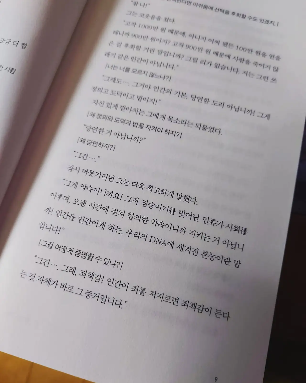 “그게 약속이니까요.! 그저 짐승이기를 벗어난 인류가 사회를 이루며, 오랜 시간에 걸쳐 합의한 약속이니까 지키는 거 아닙니까! 인간을 인간이게 하는, 우리의 DNA에 새겨진 본능이란 말입니다!”