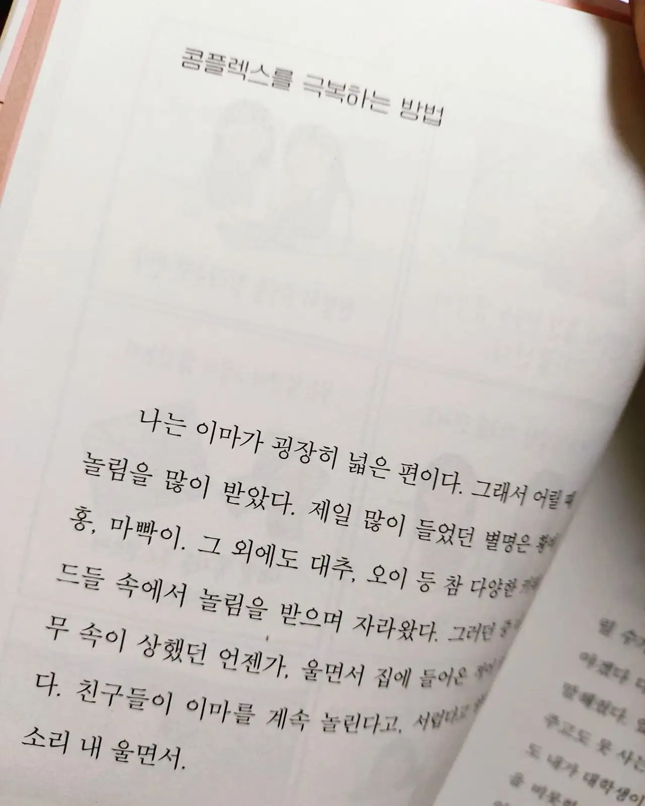 이 책의 챕터중 콤플렉스에 대한 글을 읽게 되었다. 그러다 보니 나의 콤플렉스에 대한 생각이 문득 떠오른다. 어릴 적 통통한 체격에 운동신경은 발달을 해서 날아다니는 돈까스라 불리던 그때, 나는 콤플렉스로 똘똘 뭉친 아이였다.또래 보다 발육이 남달라서 엄마 옷과 오빠 옷을 입어야 했고, 치아도 삐뚤빼뚤해서 시원하게 웃지도 못하고, 쌍거풀도 없어서 책상에 앉아 밤늦게까지 숙제는안하고 거울 앞에서 실핀과 딱풀로 쌍거풀을 그리고 치아에 씹던 껌을 윗니에 가지런히 붙여 실핀으로 치아사이의 금을 그으며 거울을 보던 그 시절. 나는 내게 포장된 모든 외모를 조금 씩 다르게 변형하면서 일기장엔 수도없이 치아교정, 쌍거풀 수술, 살빼기 라는 글자를 빡빡이 하듯 써서 매일 빈 공책을 메웠다. 그렇게 얼굴에 그림을 그리고 공책에 글을 쓰기 시작하면서 쌍거풀은 자연히 생기게 되었고, 치아는 대학가서 교정하게 되었고, 살도 고등학교 올라가서 줄넘기 하루에 1000번씩 하면서 빼기 시작했다. 콤플렉스는 나를 억압했지만, 한편으론 나를 이기기 위한 노력의 원동력을 제공해주기도 했다. 그리고 내 속에 있던 콤플렉스가 너무 싫어 나의 내면을 풀어내는 글을 쓰는 것이 습관이 되자, 가로 늦게 이렇게 글쟁이가 되어 많은 사람들에게 내 글을 보여주게 되었다.