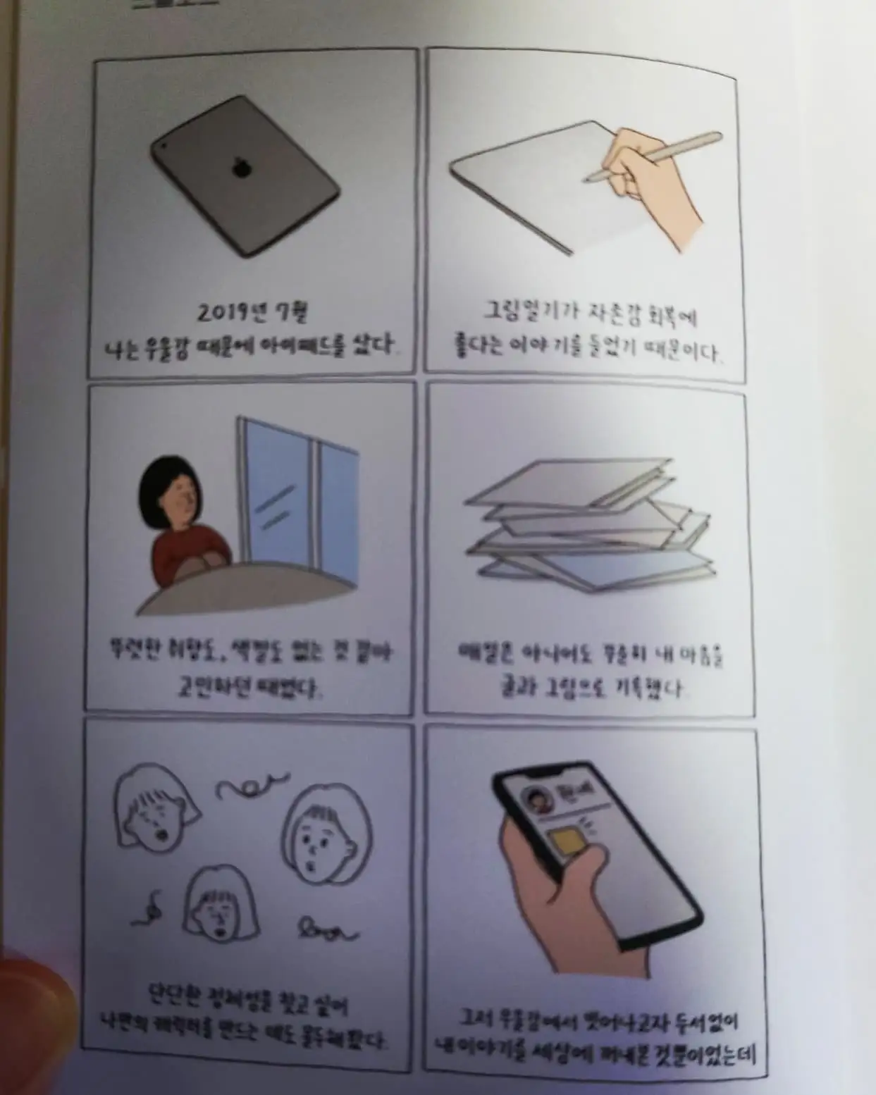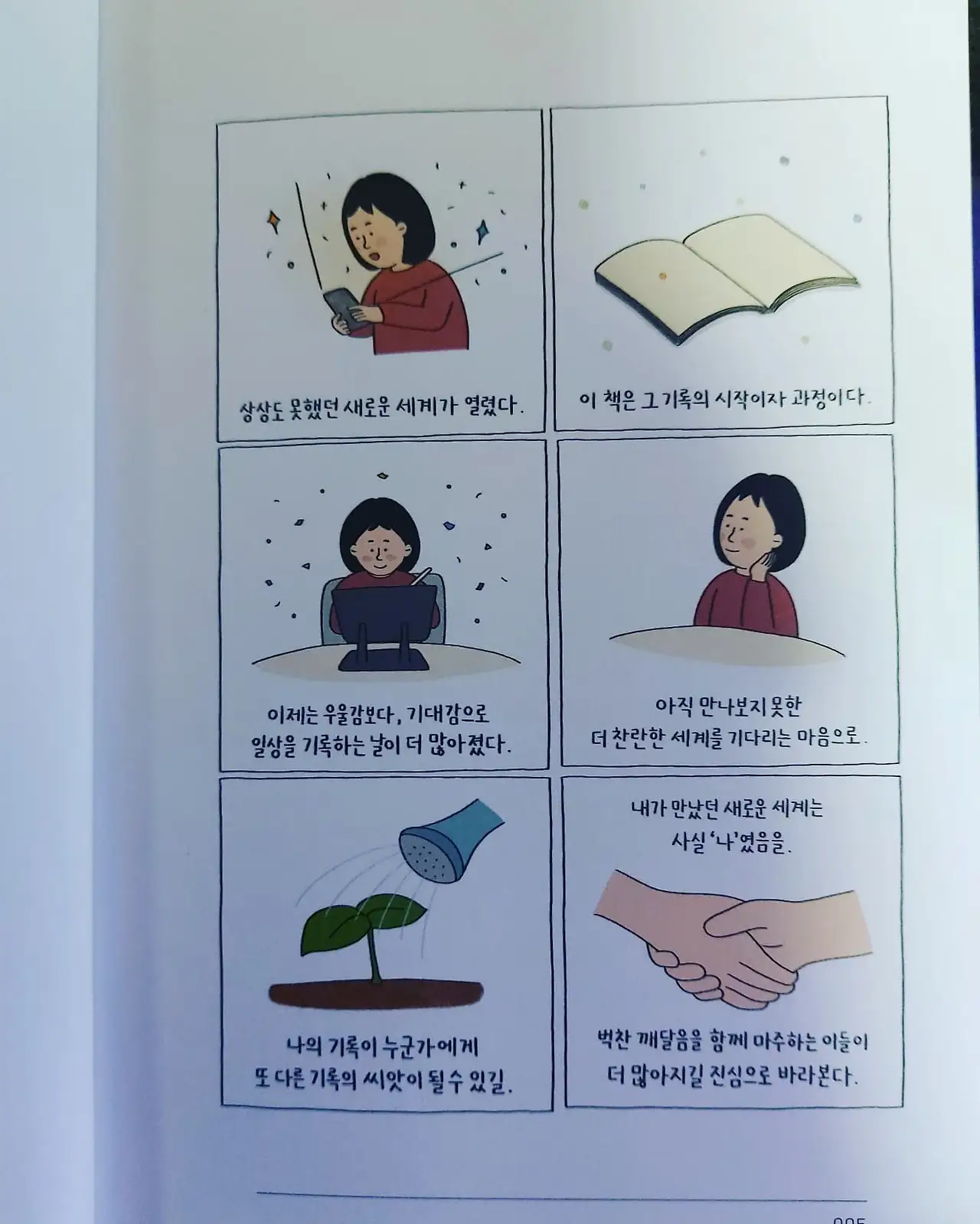 <프롤로그 중> 2019년 7월 나는 우울감 때문에 아이패드를 샀다. 그림일기가 자존감 회복에 좋다는 이야기를 들었기 때문이다. 뚜렷한 취향도, 색깔도 없는 것 같아 고민하던 때였다. 매일은 아니어도 꾸준히 내 마음을 글과 그림으로 기록했다. 단단한 정체성을 찾고 싶어 나만의 캐릭터를 만드는 데도 몰두해봤다. 그저 우울감에서 벗어나고자 두서없이 내 이야기를 세상에 꺼내본 것 뿐이었는데. 상상도 못한 새로운 세계가 열렸다. 이 책은 그 기록의 시작이자 과정이다. 이제는 우울감보다, 기대감으로 일상을 기록하는 날이 더 많아졌다. 아직 만나보지 못한 더 찬란한 세계를 기다리는 마음으로 나의 기록이 누군가에게 또다른 기록의 씨앗이 될 수 있길. 내가 만났던 새로운 세계는 사실 ‘나’였음을 벅찬 깨달음을 함께 마주하는 이들이 더 많아지길 진심으로 바라본다.