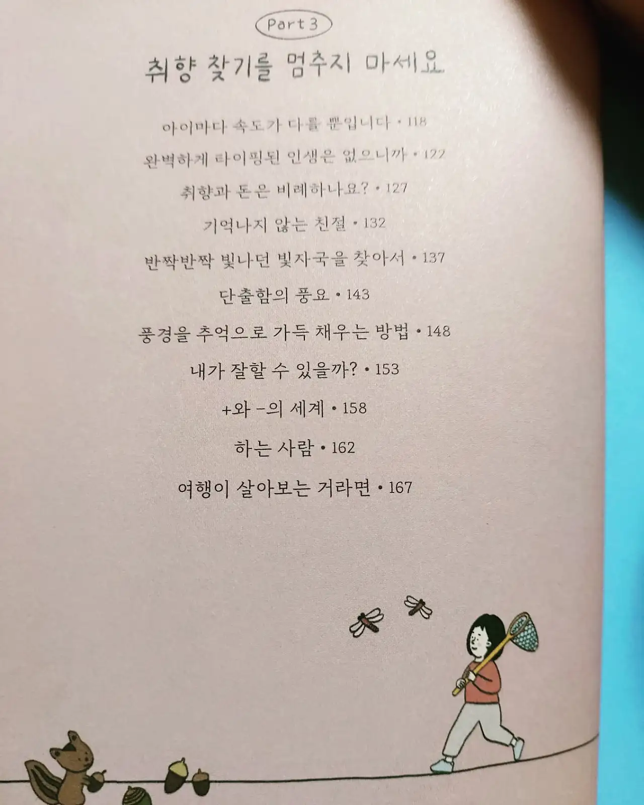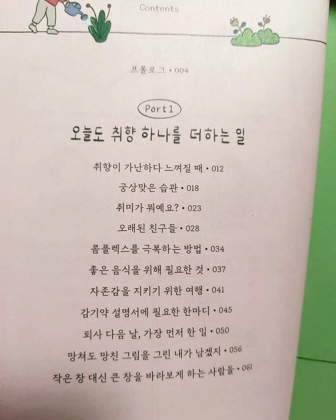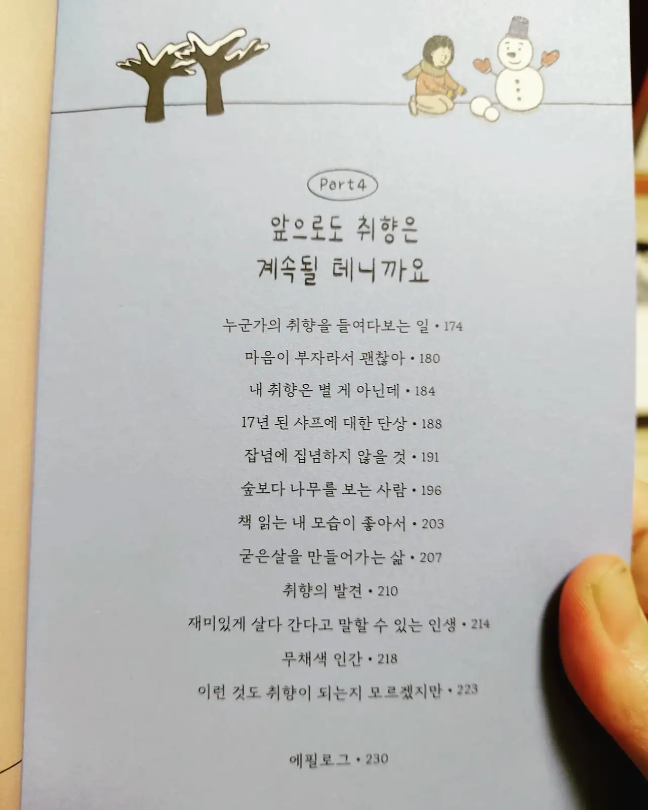 이렇게 소소하고 생활 밀접한 이야기들을 곁들인 에세이가 참 좋다. 날 것의 느낌. 그런데 어떤 사람들은 확고한 자기 취향을 이야기 하는 반면에 어떤 사람들은 뭐든 두루뭉술하게 다 좋다고 이야기 하는 사람이 있다. 두루뭉술하게 취향을 이야기 하는 사람은 취향이 없는 것일까? 분명 그 사람은 그 사람만의 취향이 있지만 표현하기가 두려워서 또는 본인의 취향을 자신있게 이야기 하지 못하는 것일 것이다. 싫어하는 색깔, 싫어하는 반찬, 싫어하는 숫자는 잘 알면서 좋아하는 색깔, 좋아하는 반찬, 좋아하는 숫자는 알지만 이야기를 꺼내기 싫어하는 건 자신감이 없어서일 것이다. 하지만 이제는 그런 부끄러움은 내려놓고 자기만의 색깔을 드러내기를 바란다. 콤플렉스 덩어리였던 나였기에 나의 취향이 더욱 확고해졌으니...