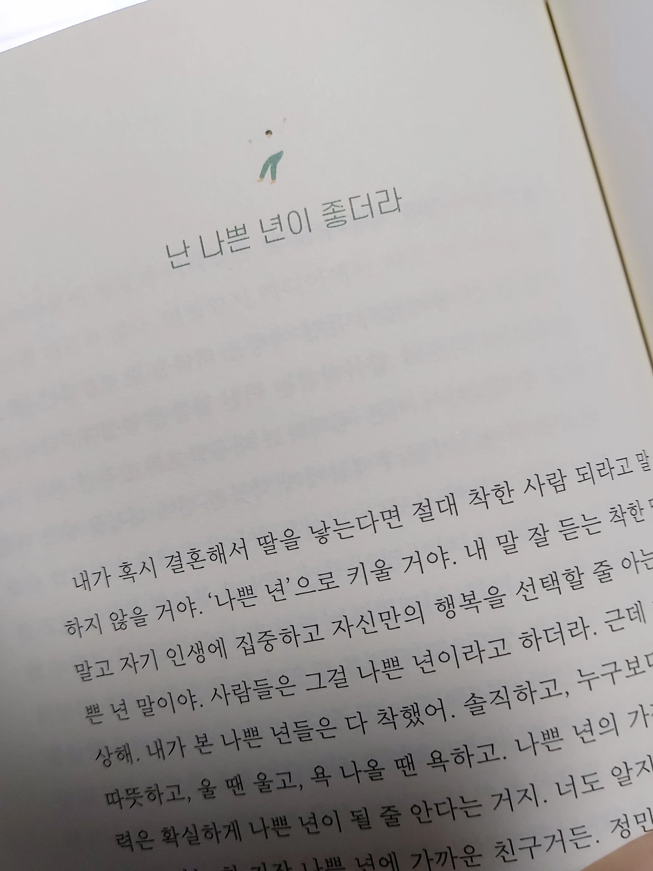 호구할래, 나쁜년 할래? (중략) 나쁜년하고 가끔 할 말도 하면서 내마음도 좀 챙겨야 매번 울면서 무너지지 않아. (중략) 실수해놓고 “어쩔수 없네요?”하고 , 하고 싶은 말 막 내뱉고 그래도 되는 거거든. 나쁜년 소리만 들었지 정작 나는 점점 순해진다니까?