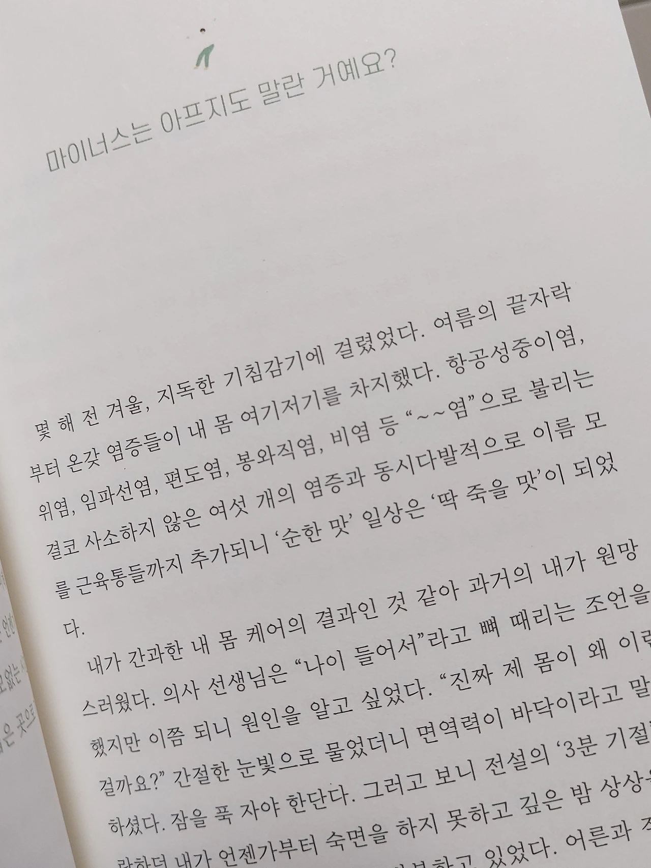 p.79 ‘마이너스는 아프지도 말라는 거에요?’ 이야기에서 작가는 엄청 지독한 감기에 걸렸는데도 연차가 마이너스여서 병가도 내지 못하는 안타까운 사연이 적혀 있었다. 읽으면서 나는 이정도면 병원에 입원해서 한 일주일 정도는 푹 입원해서 쉬어야 나을 것 같았는데, 쉬지 못하는 그 서러움에 대해 생각을 하다가 문득 나도 같은 경험을 한 적이 있어 그 때의 일을 적어보려 한다.