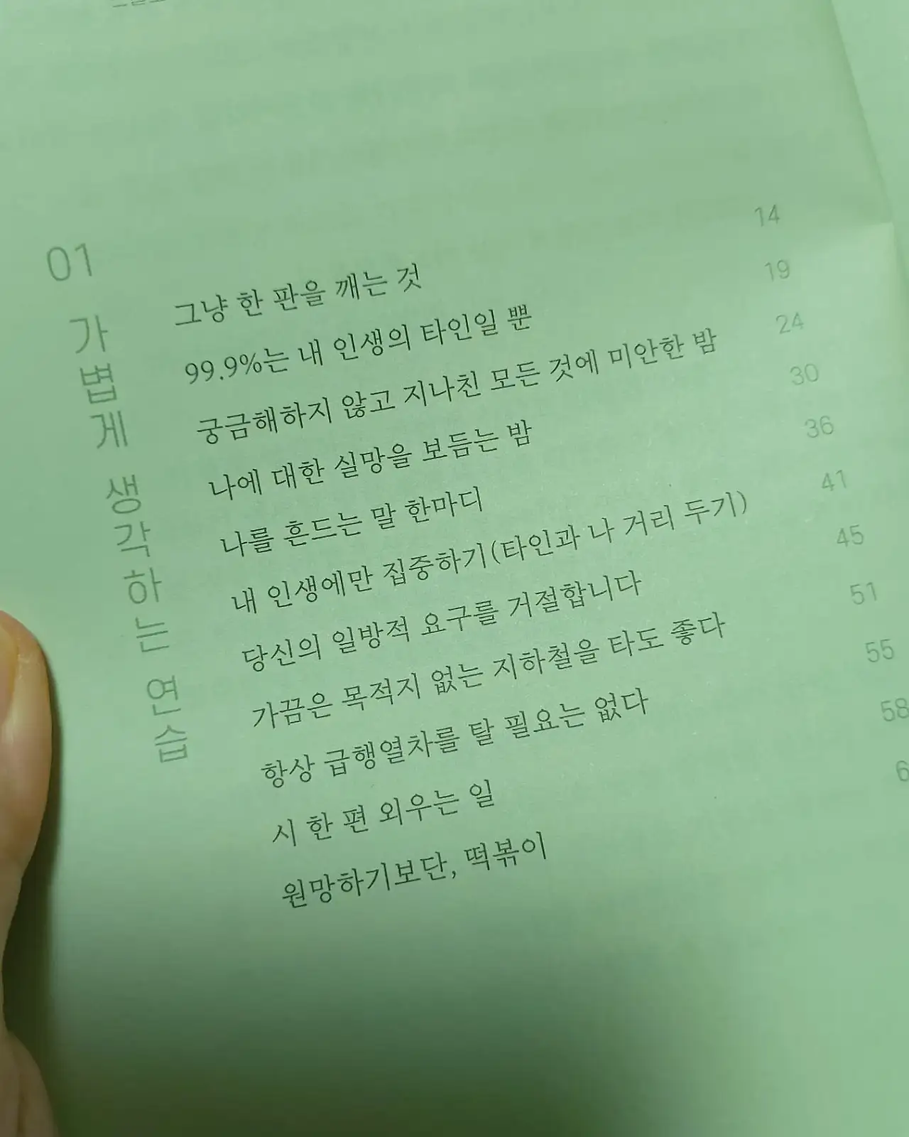 읽고 난 후의 느낌을 한마디로 표현하자면, ‘나의 사고방식이 엄지손가락과 검지손가락으로 내 눈 앞에 보이는 장면을 걷어낼 수 있을 정도로 아주 가볍고 산뜻해졌다’ 라고 말하고 싶다.