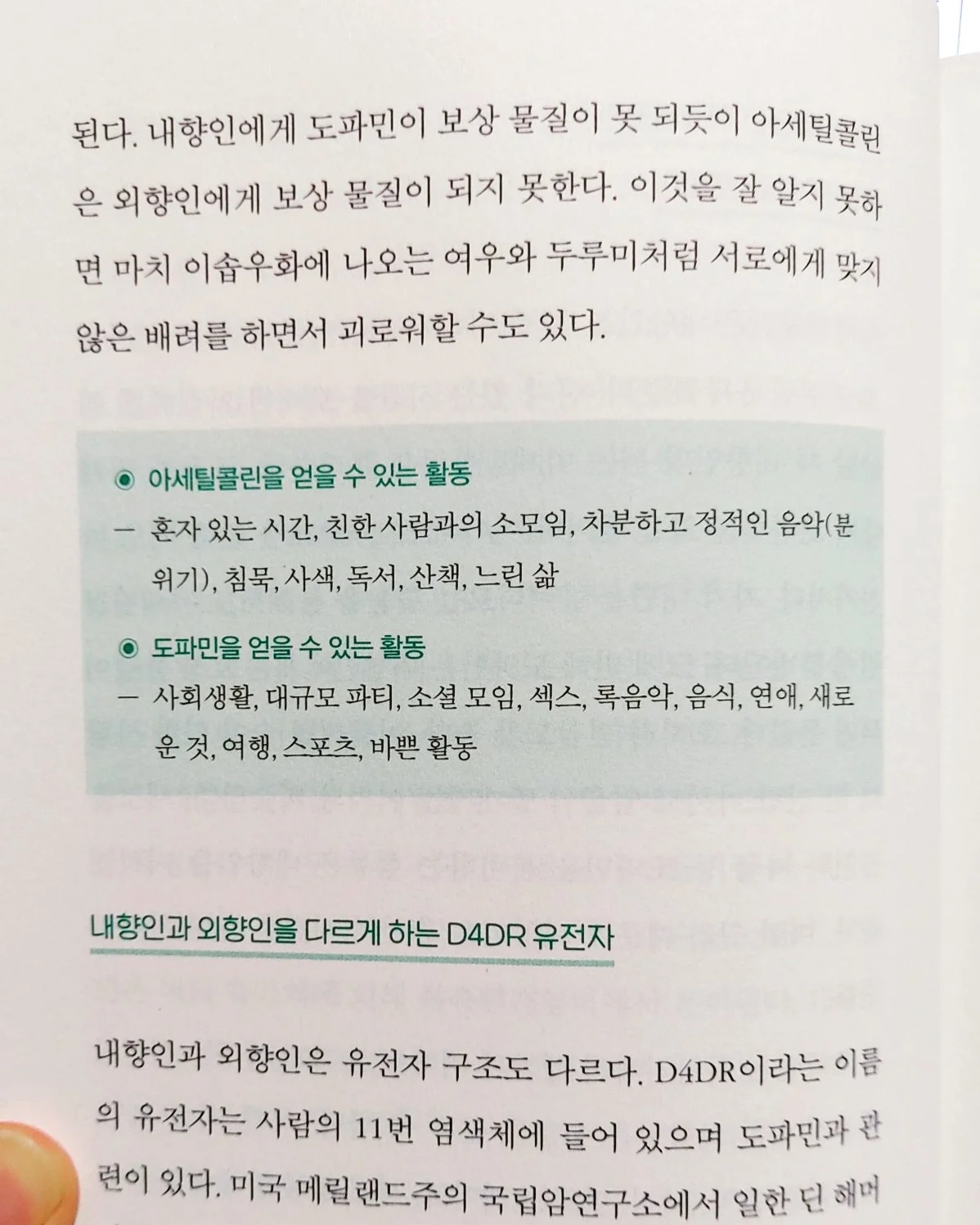 외향인 에게는 도파민 도파민은 교감신경계에서 분비되는 물질로 우리 몸은 행동의 동기를 부여하고 자극한다. 아세틸콜린은 부교감신경계에서 분비되는 물질로 몸을 이완할 필요가 있을 때 분비된다. 외향인은 교감신경계가 발달돼 있고, 내향인은 부교감신경계가 발달돼 있다. 도파민을 얻을 수 있는 활동- 사회생활, 대규모파티, 소셜 모임, 록음악, 음식, 연애, 새로운 것, 여행, 스포츠, 바쁜 활동 아세틸콜린을 얻을 수 있는 활동- 혼자 있는 시간, 친한 사람과의 소모임, 차분하고 정적인 음악(분위기),침묵, 사색, 독서, 산책, 느린 삶