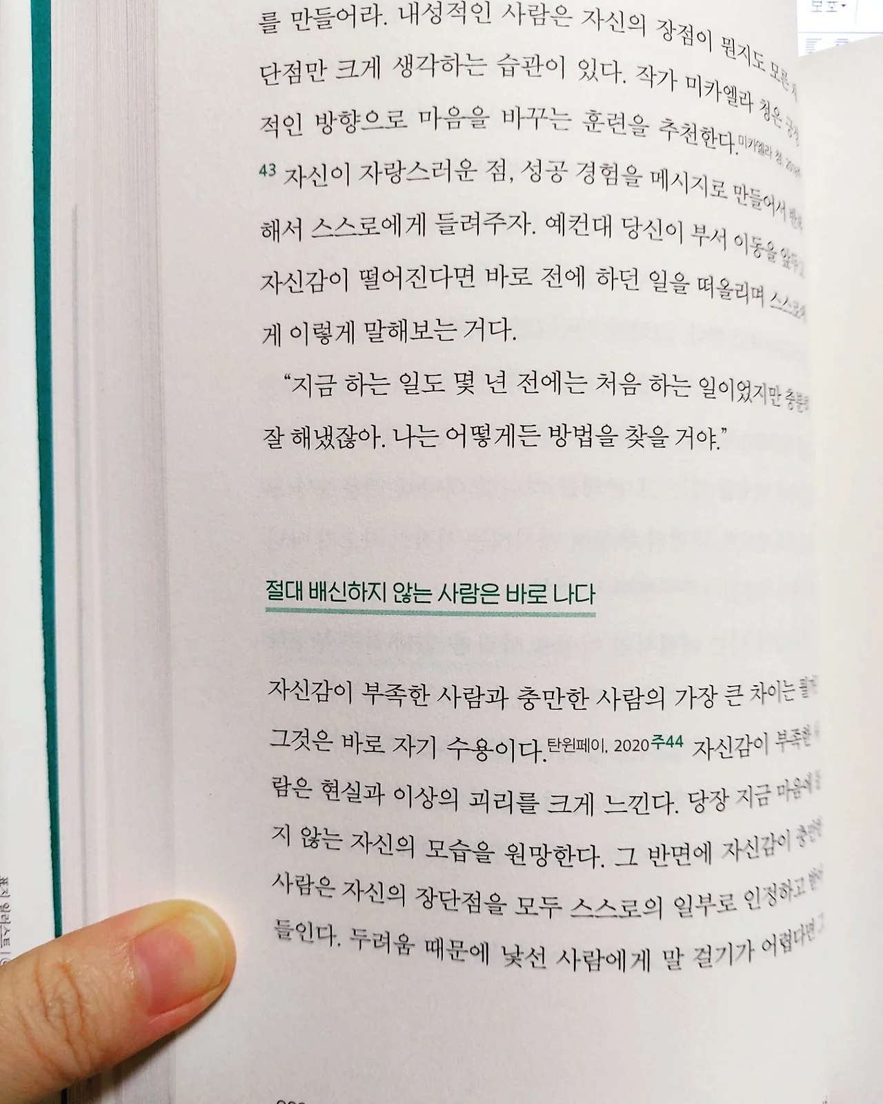 표지는 에세이처럼 예쁘지만 내용은 전문적이다. 많은 도서를 인용하여 저자의 글을 뒷받침 해주고 있어, 어렵고 유명한 책 50권 이상을 다 읽지 않아도 그 책 속의 구절을 발췌하여 책을 엮음으로써 더 전문적으로 느껴진지도 모르겠다.