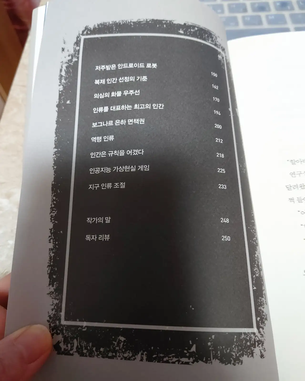김동식 작가의 소설은 이해하면 할수록 점점 더 심오하고 난해해진다. 분명 현실을 반영하고 있고, 로봇, 인공지능, 안드로이드 등에 비유한 물질이 인류의 정신보다 훨씬 더 빠르게 성장하고 있다는 것을 은유적으로 표현하고 있다는 것이 느껴진다. 신의 한 수 두 듯, 앞의 몇 수를 미리 내다보는 듯한 내용들은 김동식 작가의 의식수준이 굉장히 높은 것 같다는 생각도 들게 한다.