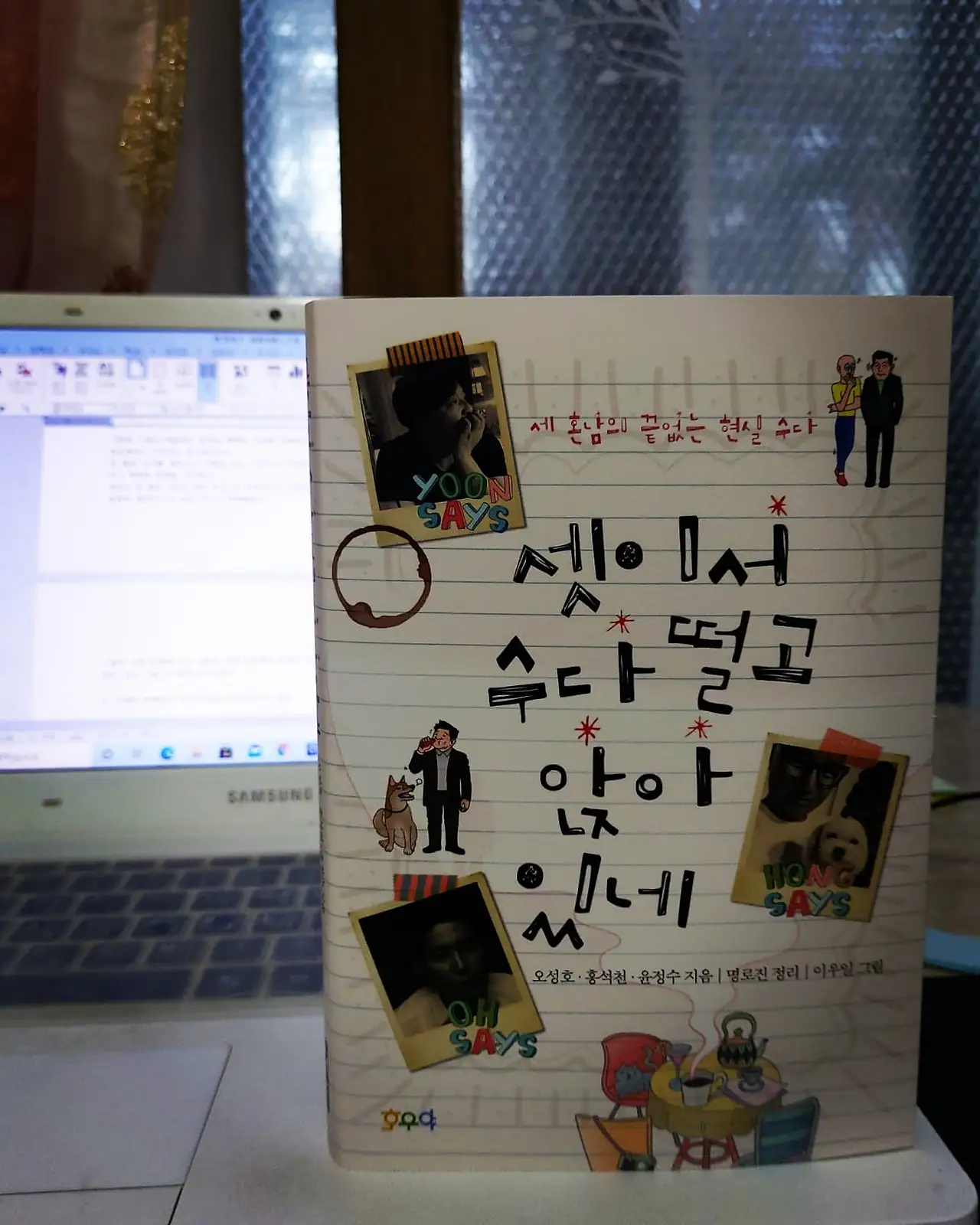#책리뷰 #오늘의책 [셋이서 수다 떨고 앉아 있네] 작가: 명로진 정리 / 오성호, 홍석천,윤정수 지음 / 이우일 그림 출판사: 호우야 발행일: 2021년 11월 5일