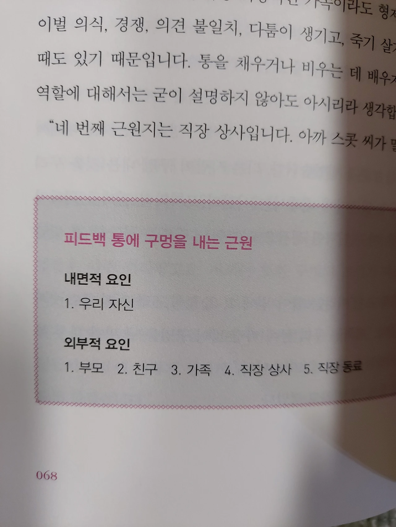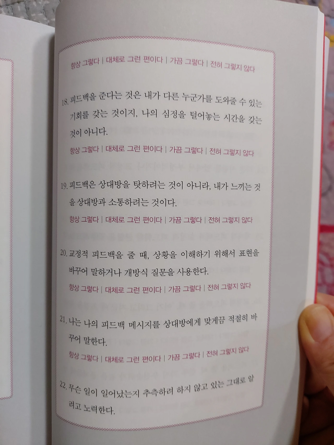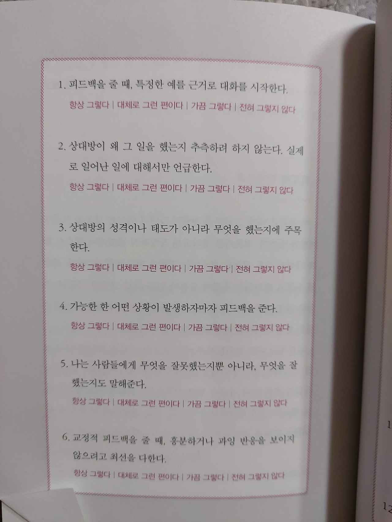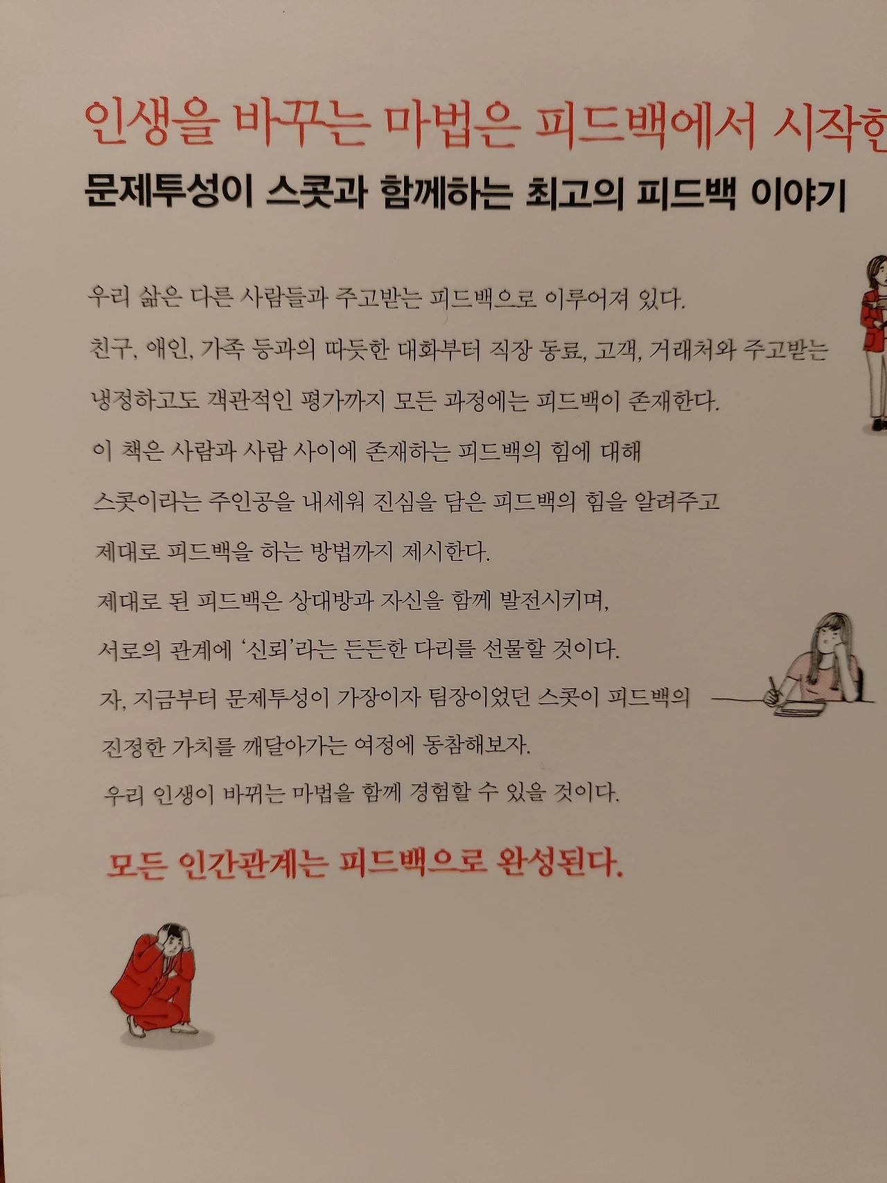 가급적이면 학대적피드백과 무의미한피드백은 지양하기로 했다. 이 책은 직장인들을 위한 자기계발서지만, 모든 대인관계에 기본인 가족과의 관계에 있어서도 발전이 있을 것 같다.