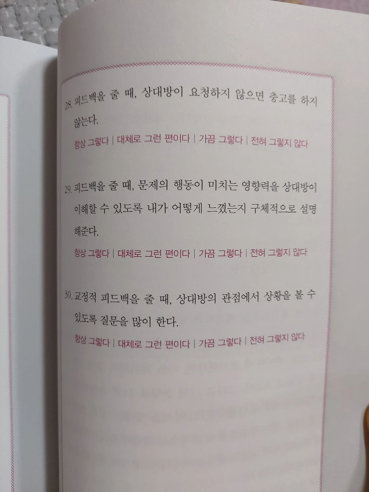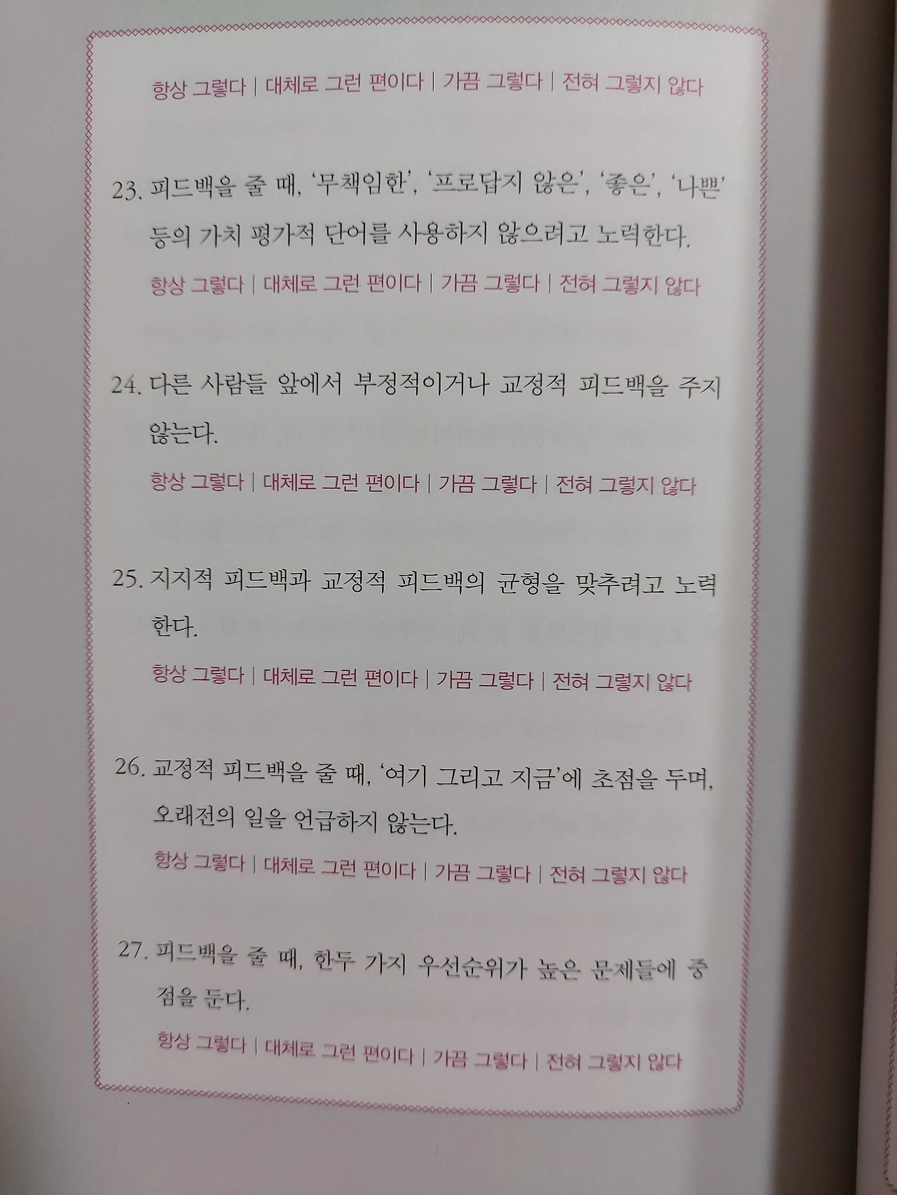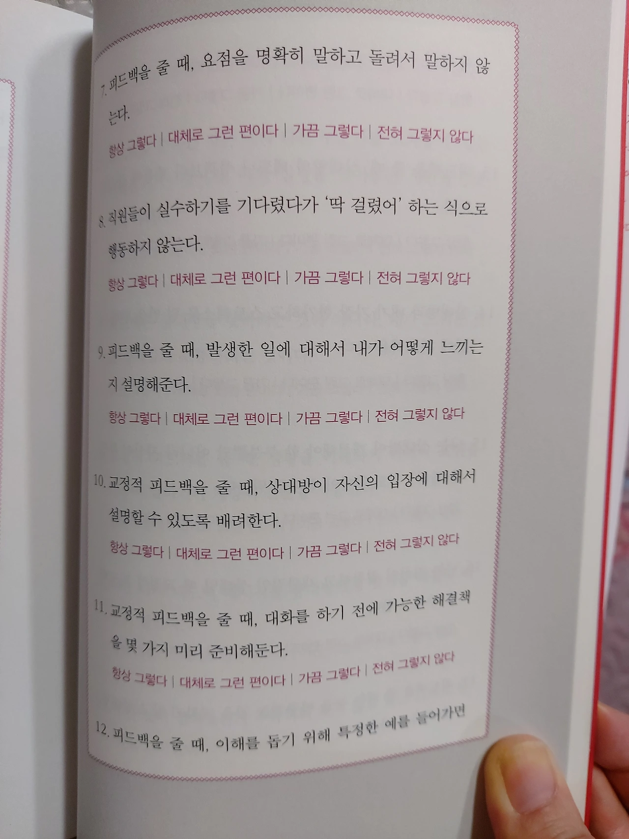가급적이면 학대적피드백과 무의미한피드백은 지양하기로 했다. 이 책은 직장인들을 위한 자기계발서지만, 모든 대인관계에 기본인 가족과의 관계에 있어서도 발전이 있을 것 같다.