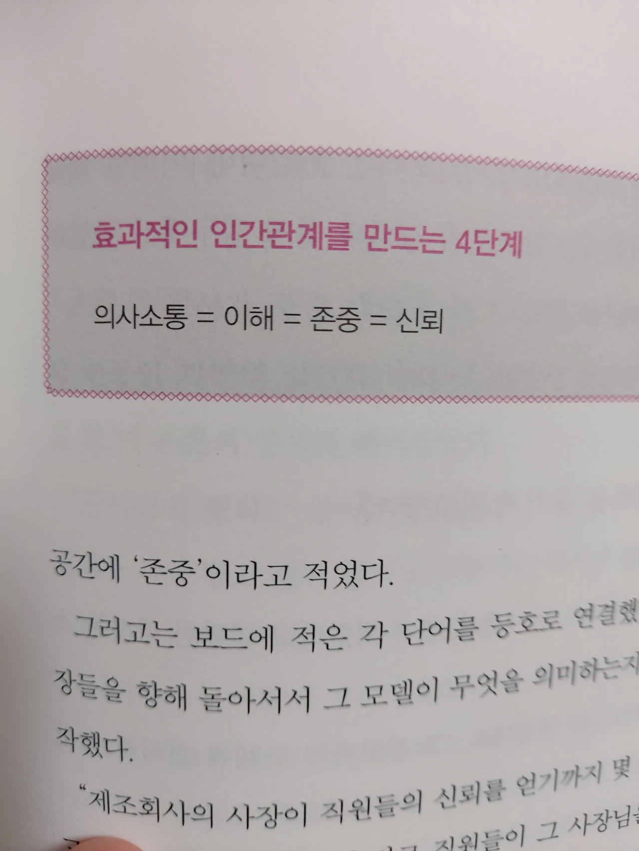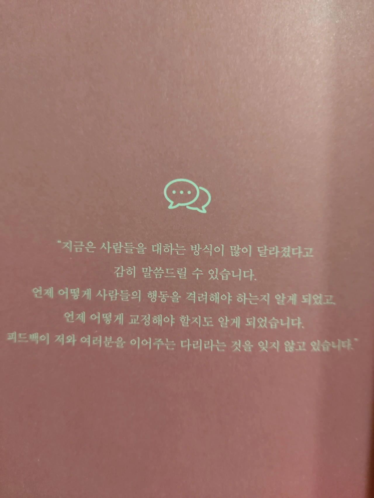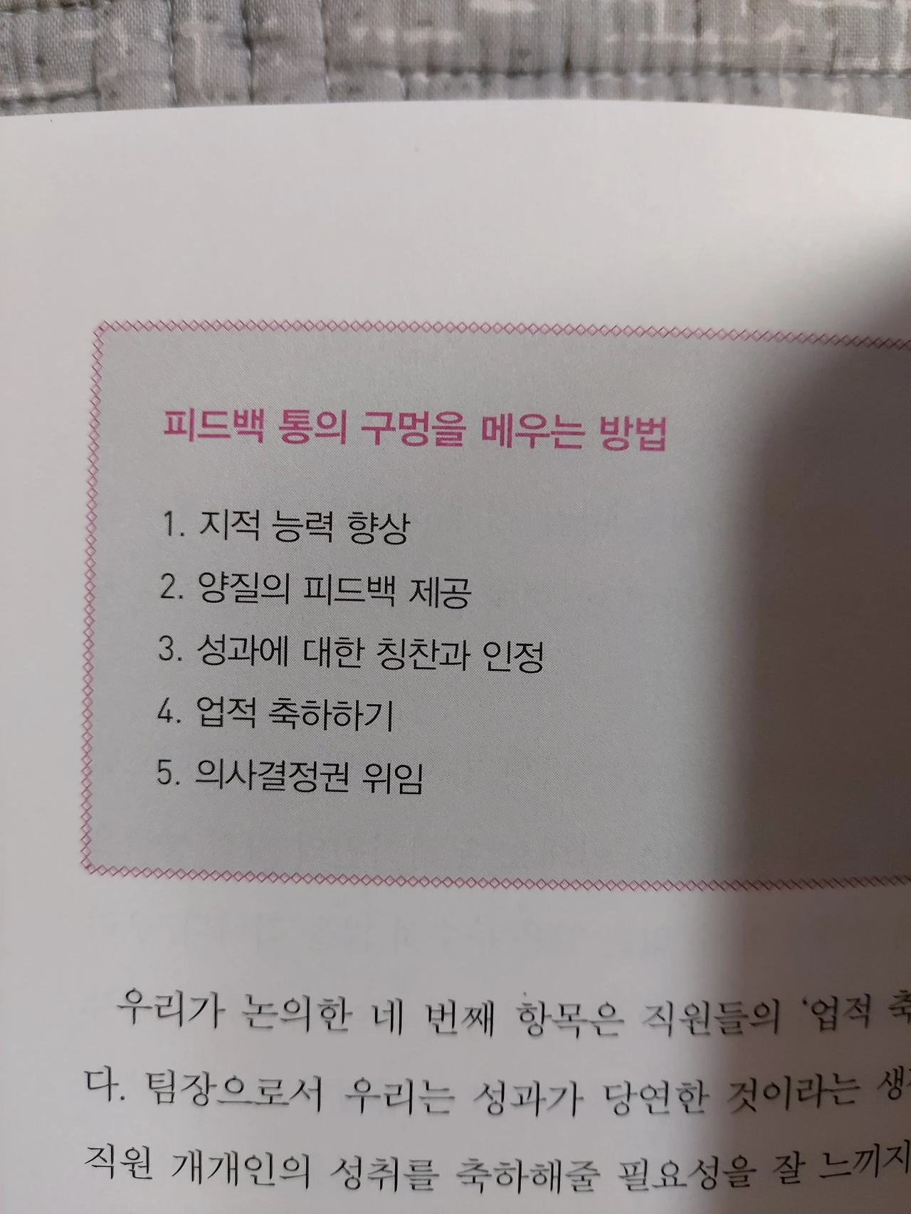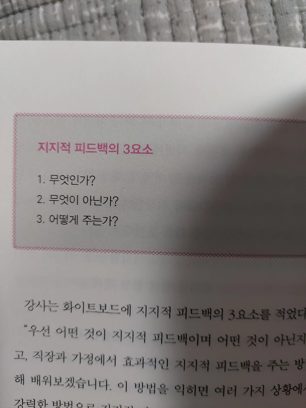 가급적이면 학대적피드백과 무의미한피드백은 지양하기로 했다. 이 책은 직장인들을 위한 자기계발서지만, 모든 대인관계에 기본인 가족과의 관계에 있어서도 발전이 있을 것 같다.