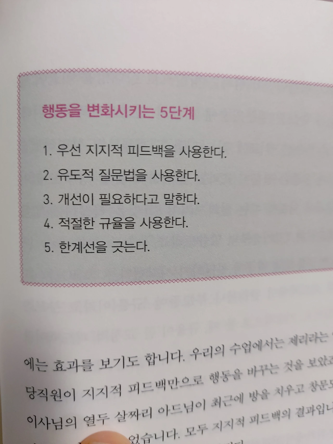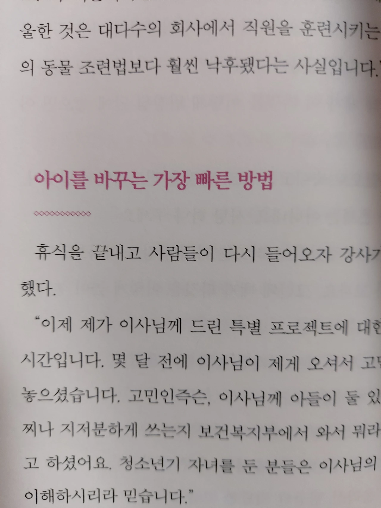 ●어제 아들과 함께 대구를 갔다 왔다. 버스의 짐칸에 캐리어를 꺼내려는데 아들이 대신하겠다고 했다. 평소같으면 다친다고 하지마! 엄마가 할거야. 라고 했을터이지만, 이 책을 읽고 나서 나는 이 행동을 장려하기 위해 지지적피드백을 해주기로 했다.