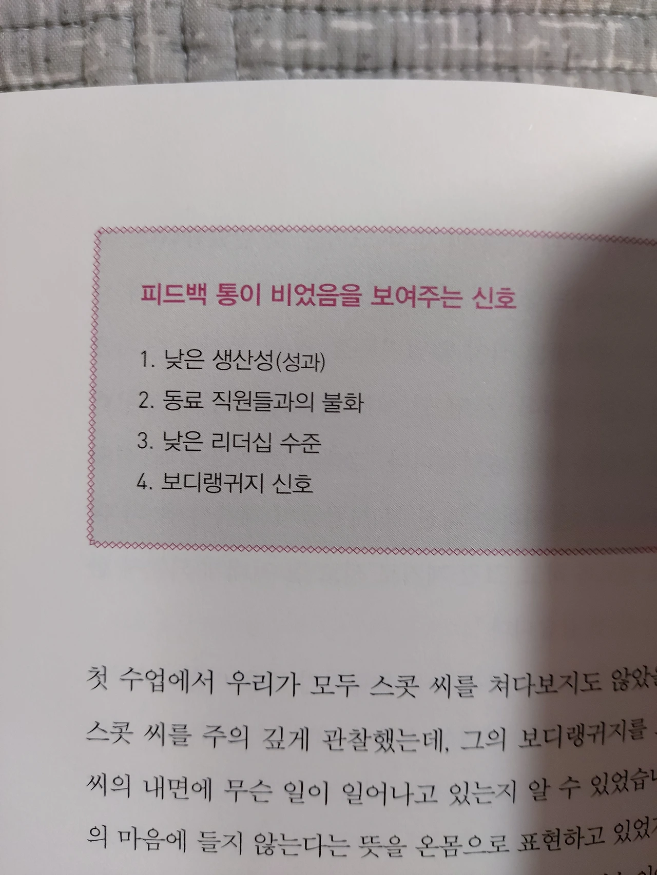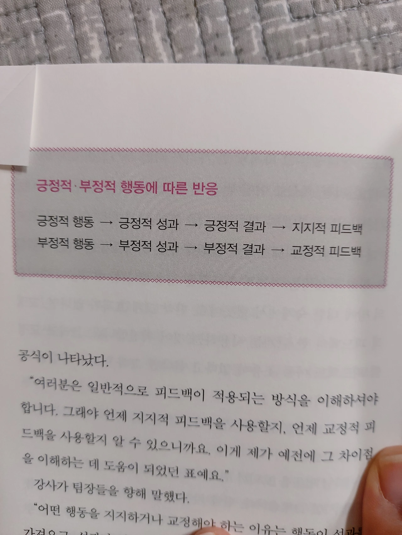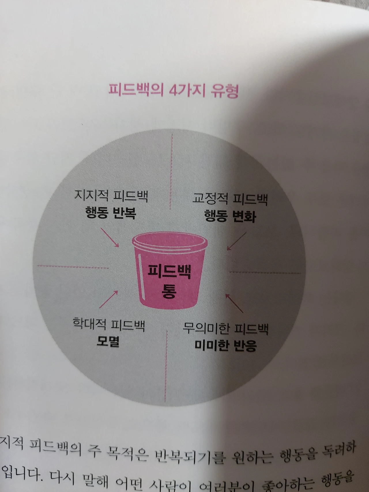 #책 속으로 지지적피드백 : 어떤 행동을 반복하도록 도와준다 교정적피드백 : 잘못된 행동에 변화를 일으켜준다. 학대적피드백 : 상대방에게 모멸감을 준다. 무의미한 피드백 : 상대방에게 아무런 영향을 주지 못한다.