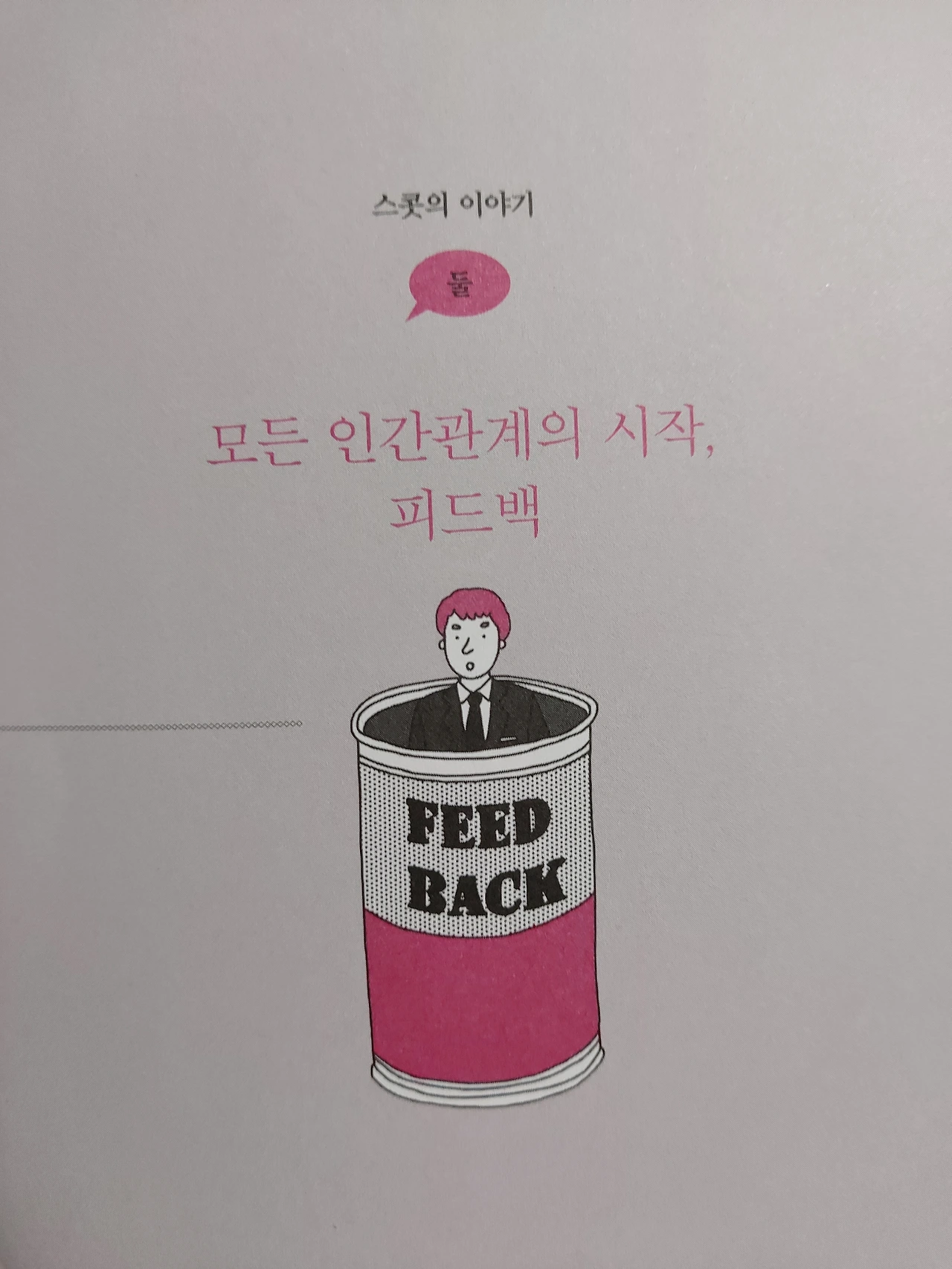 이 책에서는 피드백이라는 것을 통에 비유했다. 내가 대하는 사람에게 어떤 피드백을 주느냐에 따라 그 사람은 나를 좋게 생각하거나 싫게 느낄 것이라는 이야기다. 내가 대하는 사람이 피드백이라는 통 속에 들어있다. 내가 주는 피드백으로 통을 채우는 그는 내게 행복을 돌려줄 수도 있고, 불행을 돌려줄 수도 있다.