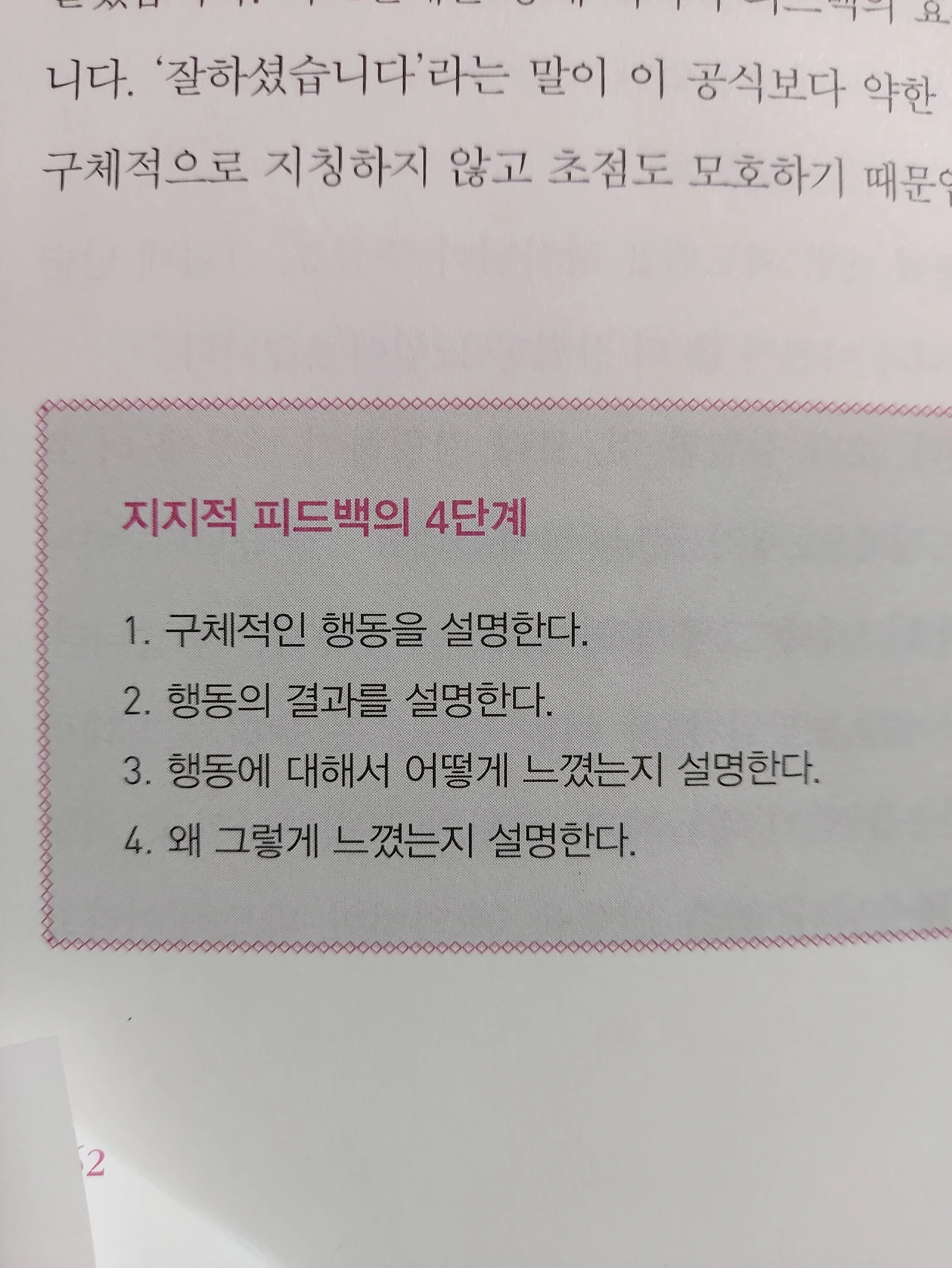 #지지적피드백의 4단계 1. 구체적인 행동을 설명한다. 2. 행동의 결과를 설명한다. 3. 행동에 대해서 어떻게 느꼈는지 설명한다. 4. 왜 그렇게 느꼈는지 설명한다.