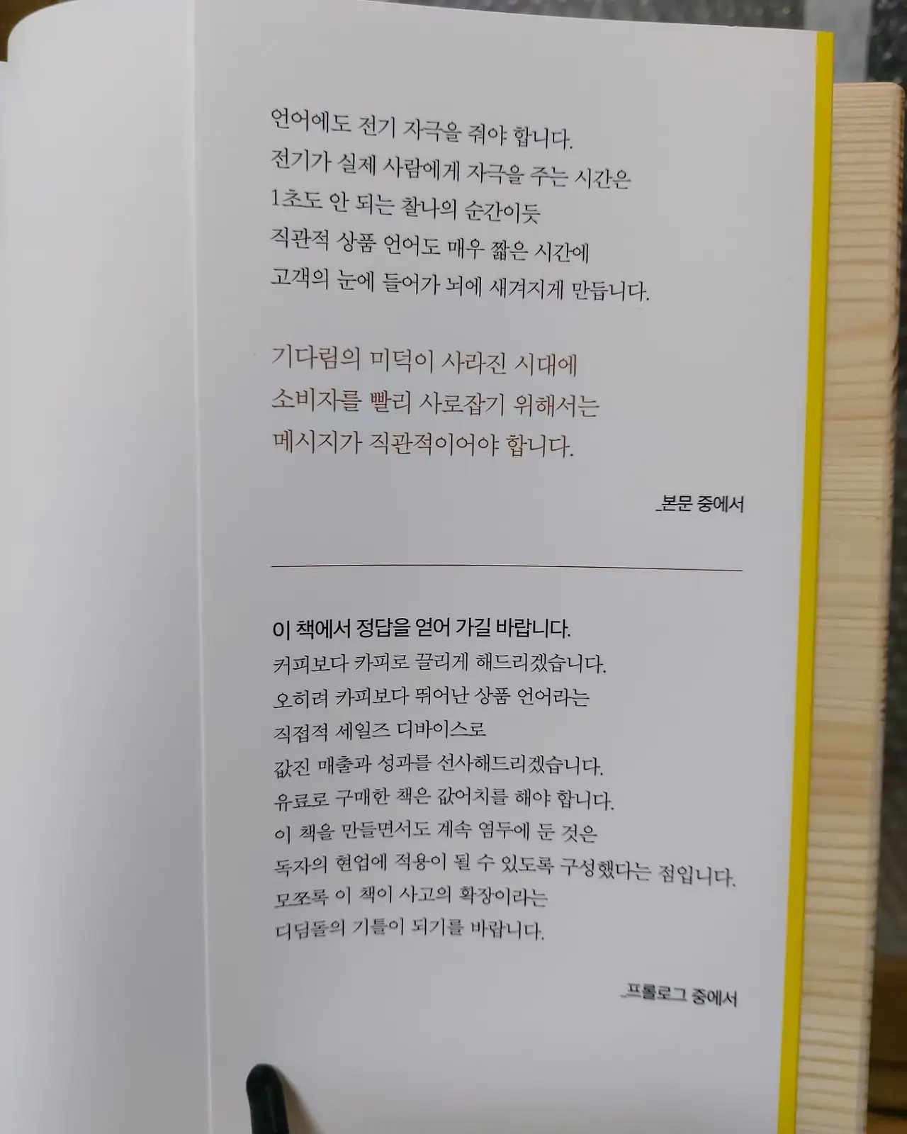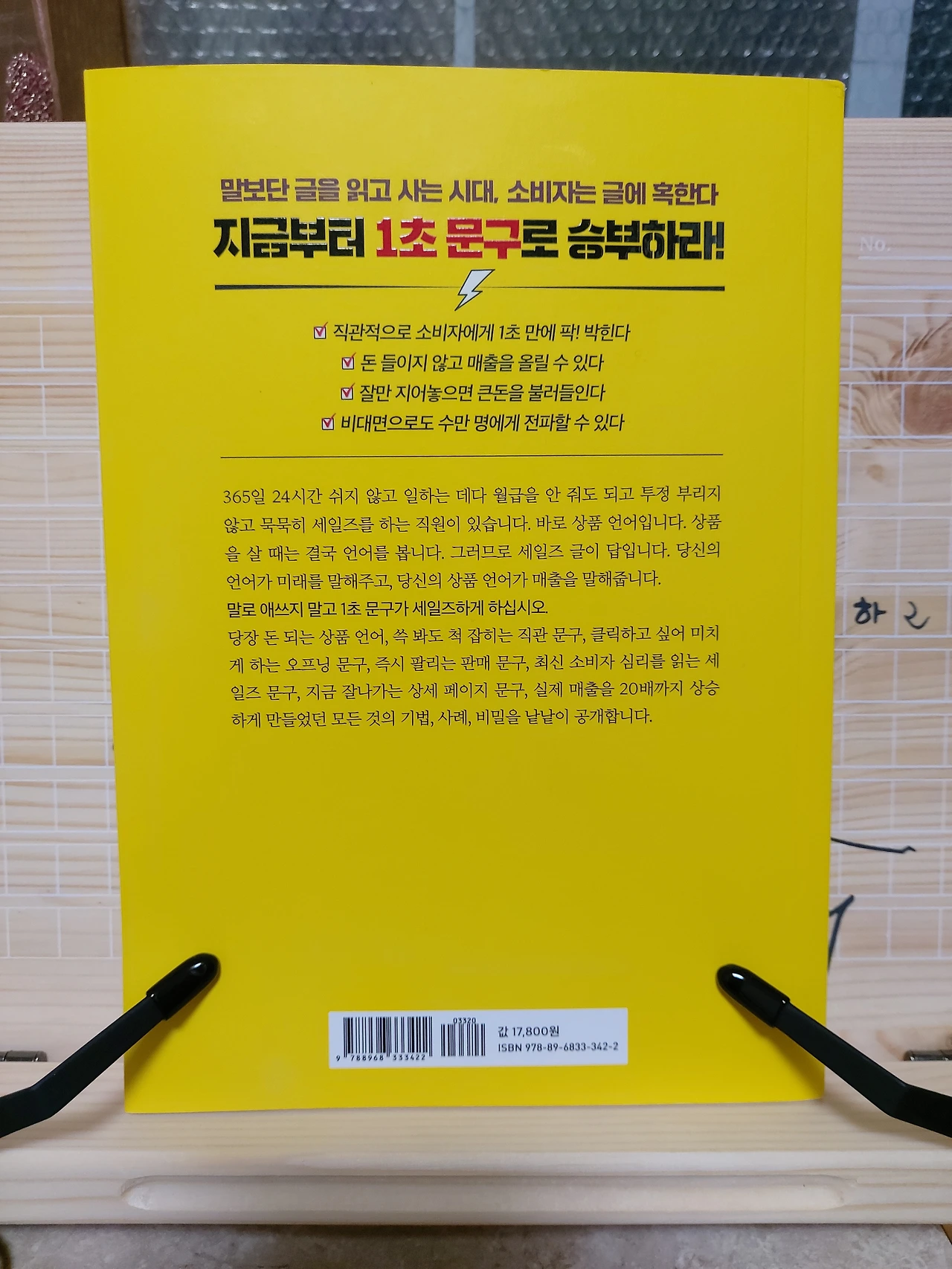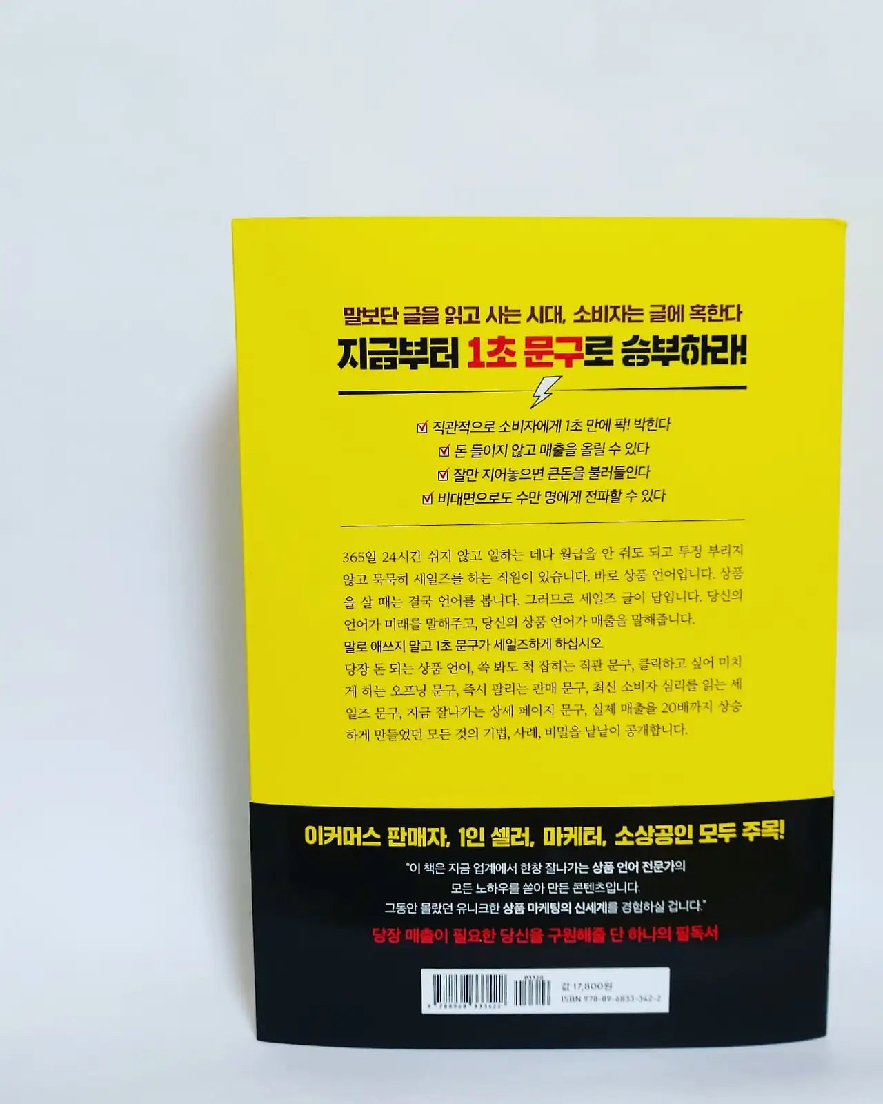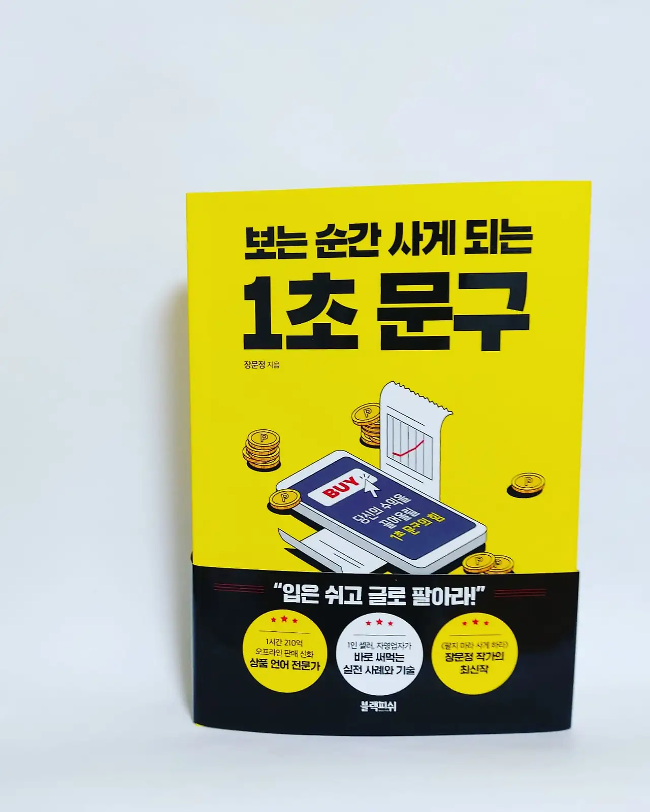#이 책은 책 제목에서도 알 수 있듯이, 1초만에 팔리는 문구에 대해 서술한 책이다. 언어에 마술을 부려 소비자의 이목을 집중시킬 자극을 주는 책이다. 읽고 나면 재미있는 발상이 많이 떠오를 것이다. 당장에 매출을 올려야 하는 마케터라면 자신이 판매하려고 하는 상품을 꼭 필요하게끔 친숙하고 재미있게 소개해 보는 건 어떨까?