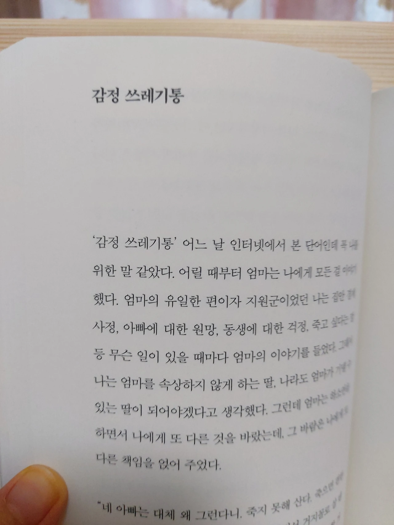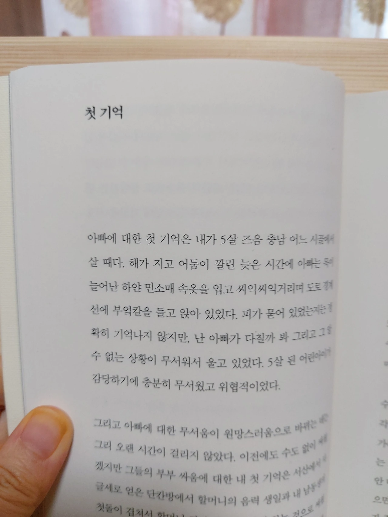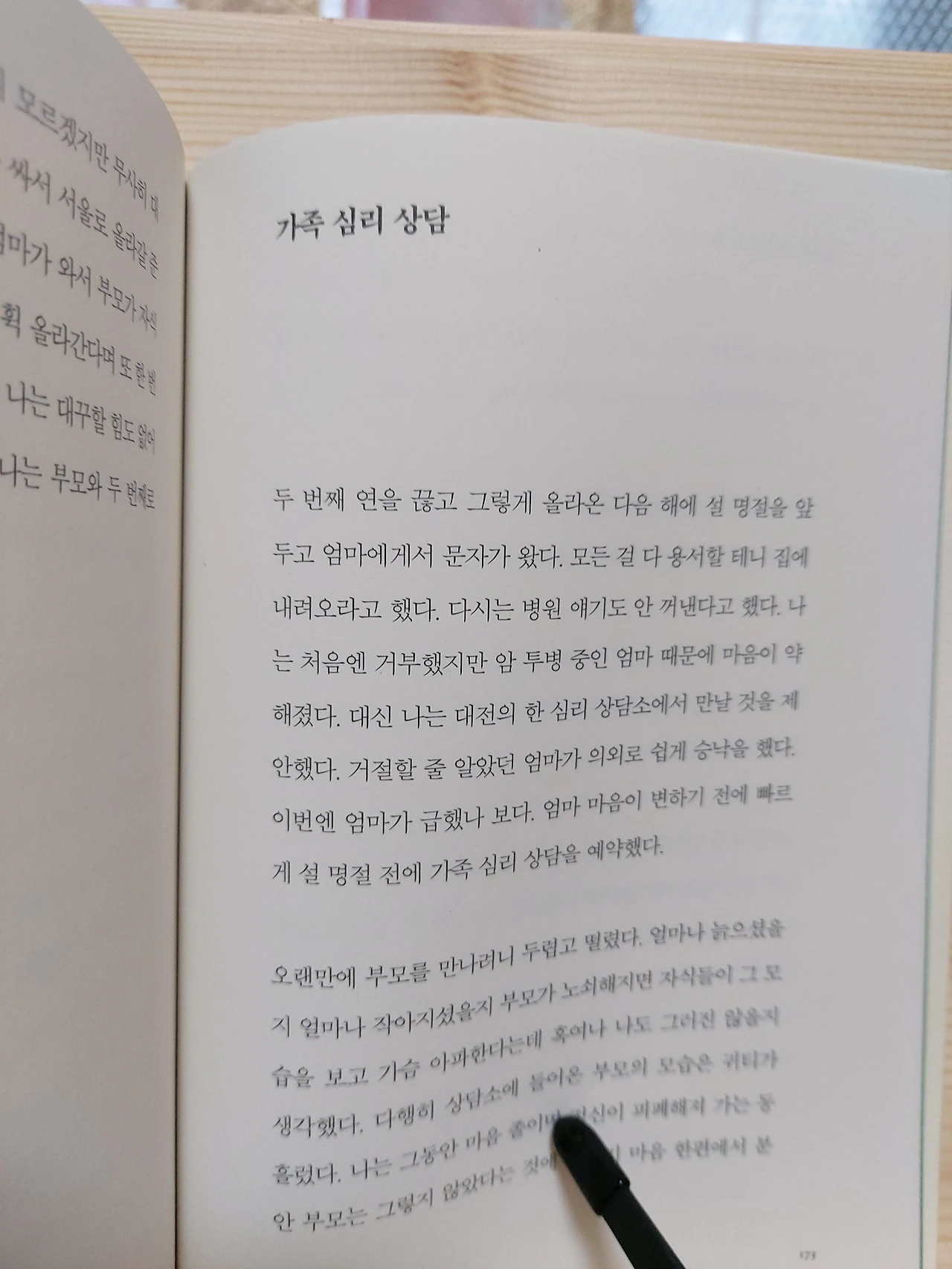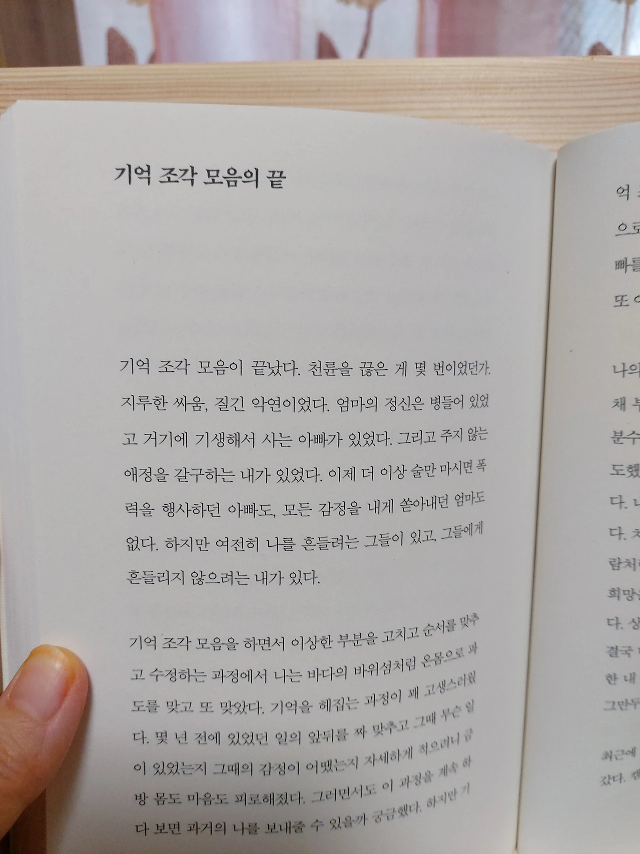 p.196“괜찮아, 네 잘못이 아니야.”울고 있던 내가 점점 어려졌다. 15살,11살,5살 어려진 나를 무릎 위에 눕히고 그 말을 계속 반복하자 한결 편안한 표정으로 어린 나는 잠이 들었다. 반면, 현실의 나는 베개가 흠뻑 젖도록 울고 있었다. 그리고 잠에서 깨어 한참을 울었다.내가 늘 하는 가정이 있다. ~했더라면, ~하지 않았을까?내가 살가웠다면 우리 가족이 좀 더 화목하지 않았을까?내가 애교도 많고 밝은 성격이라면 부모와 잘 지낼 수 있었을까?예전의 나였다면 또다시 끝없는 자책과 우울함에 빠졌겠지만, 이제는 나에게 괜찮다고 괜찮을 거라고 위로를 건넬 수 있게 됐다.