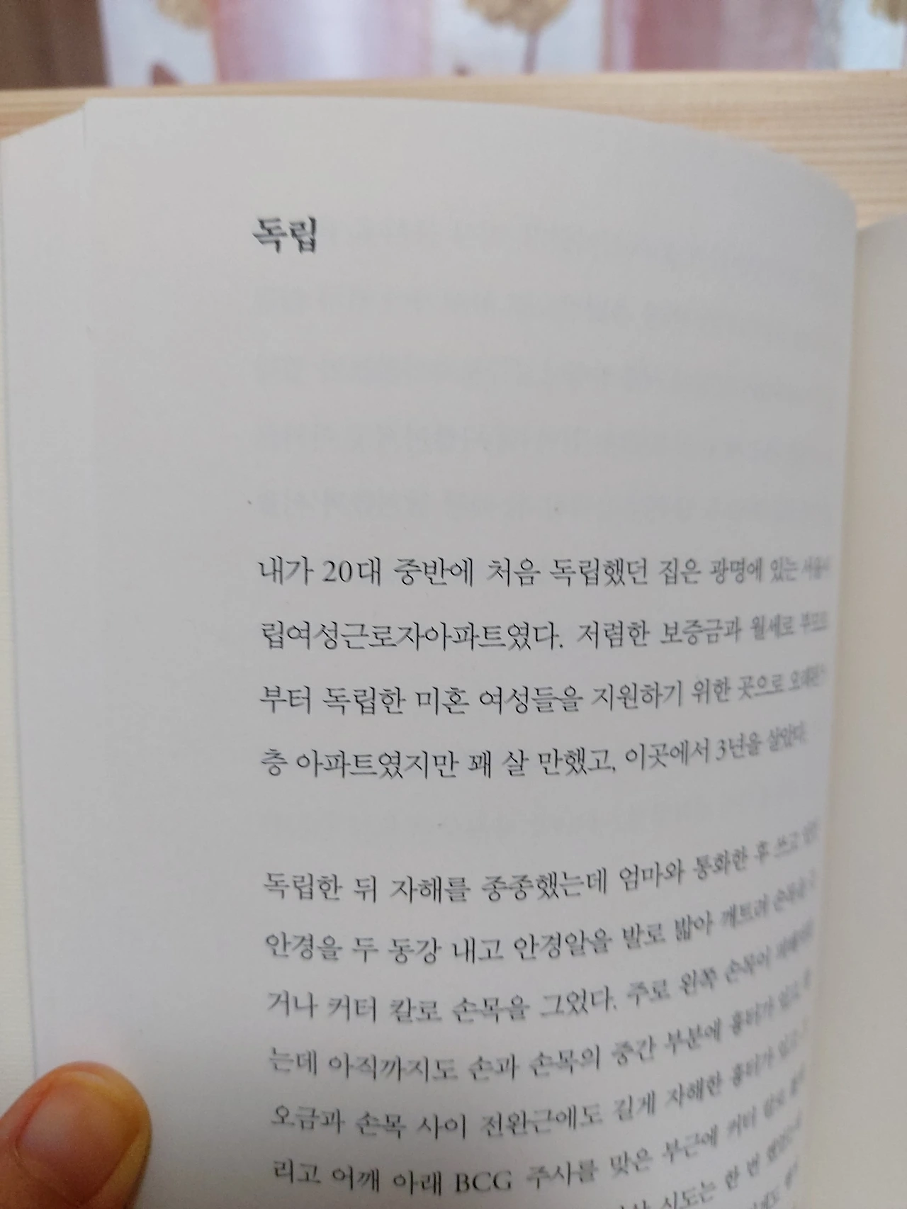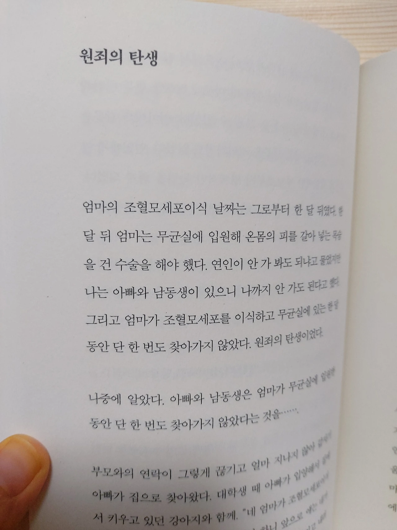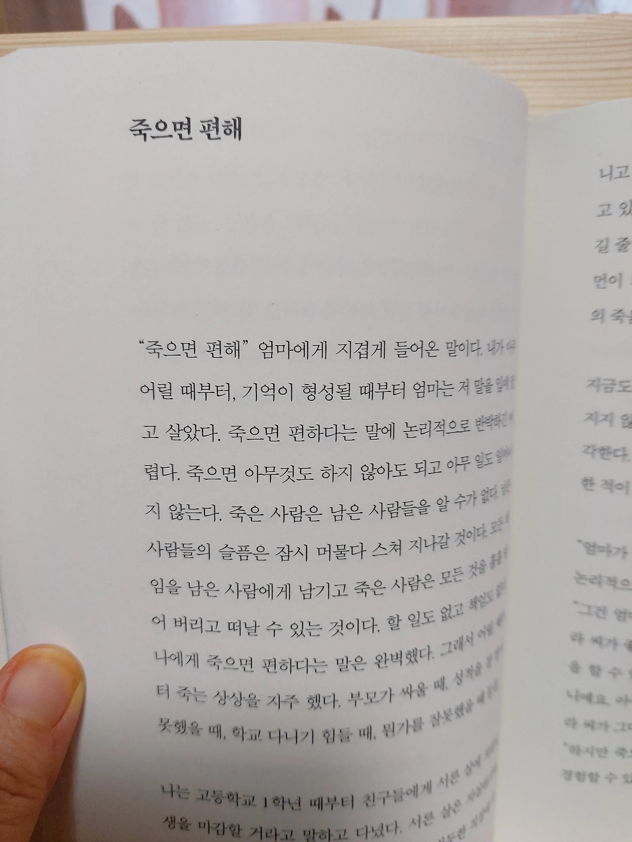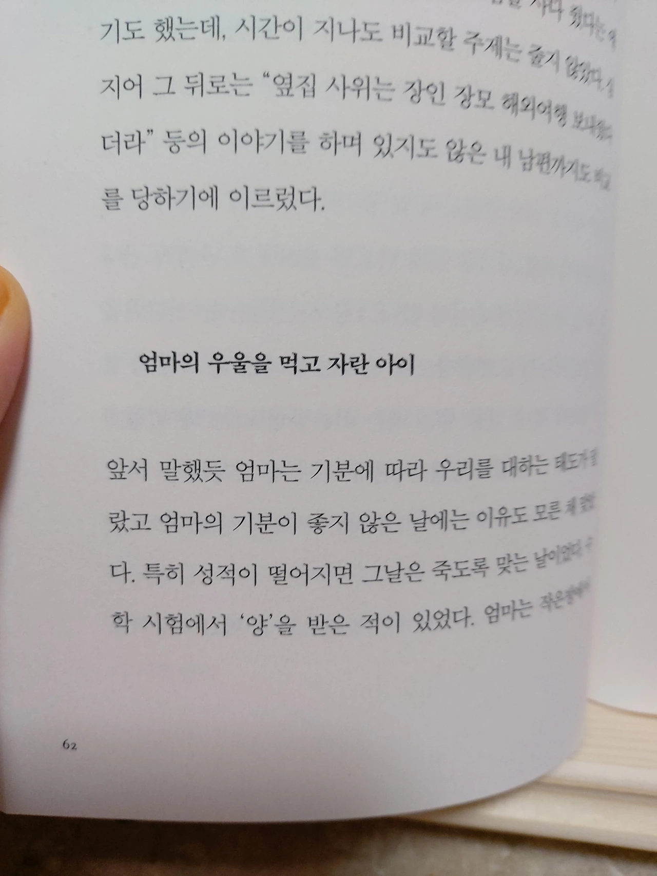 p.196“괜찮아, 네 잘못이 아니야.”울고 있던 내가 점점 어려졌다. 15살,11살,5살 어려진 나를 무릎 위에 눕히고 그 말을 계속 반복하자 한결 편안한 표정으로 어린 나는 잠이 들었다. 반면, 현실의 나는 베개가 흠뻑 젖도록 울고 있었다. 그리고 잠에서 깨어 한참을 울었다.내가 늘 하는 가정이 있다. ~했더라면, ~하지 않았을까?내가 살가웠다면 우리 가족이 좀 더 화목하지 않았을까?내가 애교도 많고 밝은 성격이라면 부모와 잘 지낼 수 있었을까?예전의 나였다면 또다시 끝없는 자책과 우울함에 빠졌겠지만, 이제는 나에게 괜찮다고 괜찮을 거라고 위로를 건넬 수 있게 됐다.