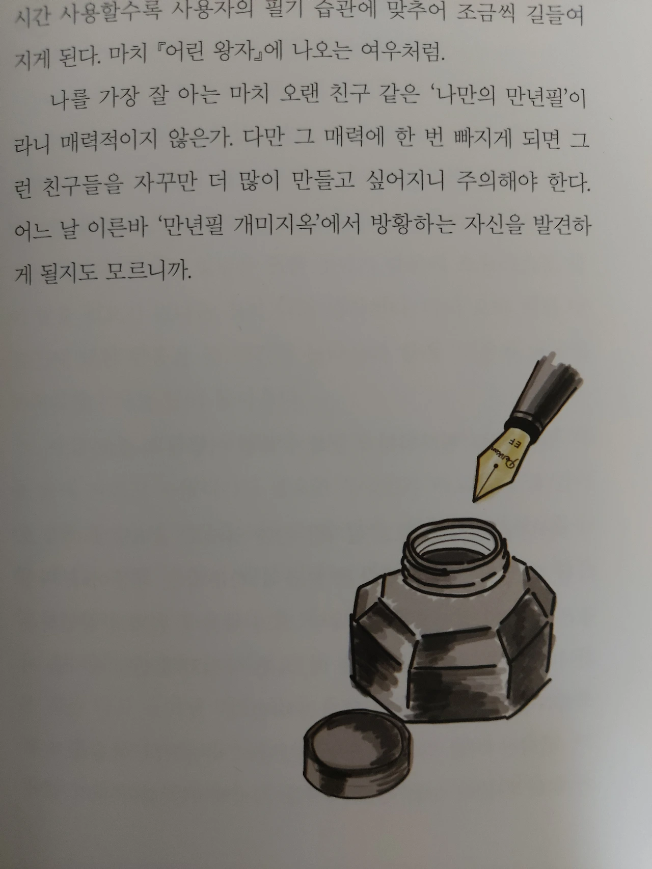 나는 필사의 기본적인 필기구 마저 만년필이 아닌 그냥 젤펜을 쓰고 있었는데, 잉크를 충전하는 만년필에 대한 설명을 읽고 그 매력에 흠뻑 빠져들었다.