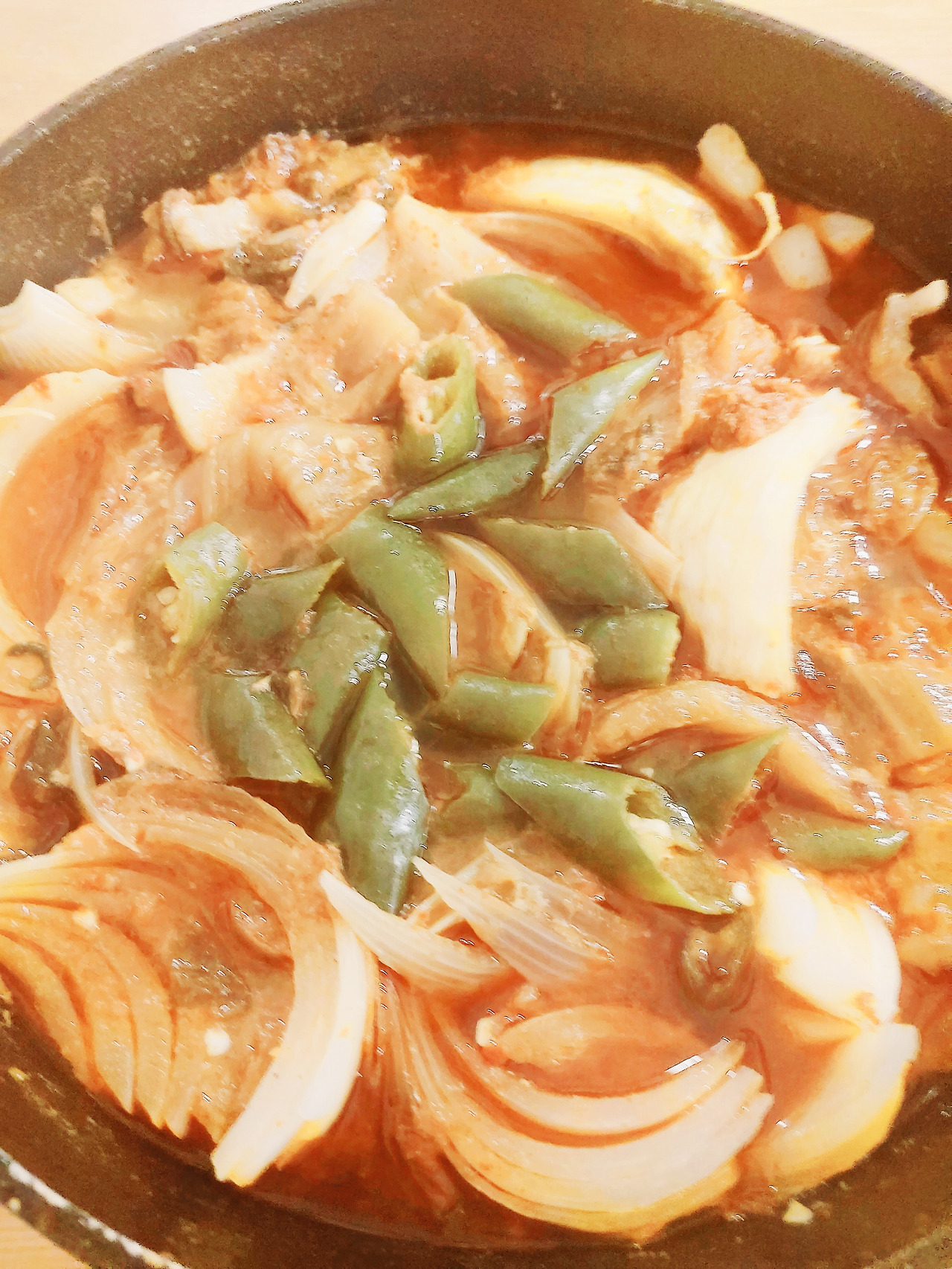 비계가 많은 삼겹살과 양파, 풋고추를 숭덩숭덩 썰어넣어 또, 어머님이 직접만드신 조청이 들어간 고추장 한숟갈 푹 떠 넣어 끓이기만 하면 기가 막히게 맛있는 김치찌개가 완성된다.