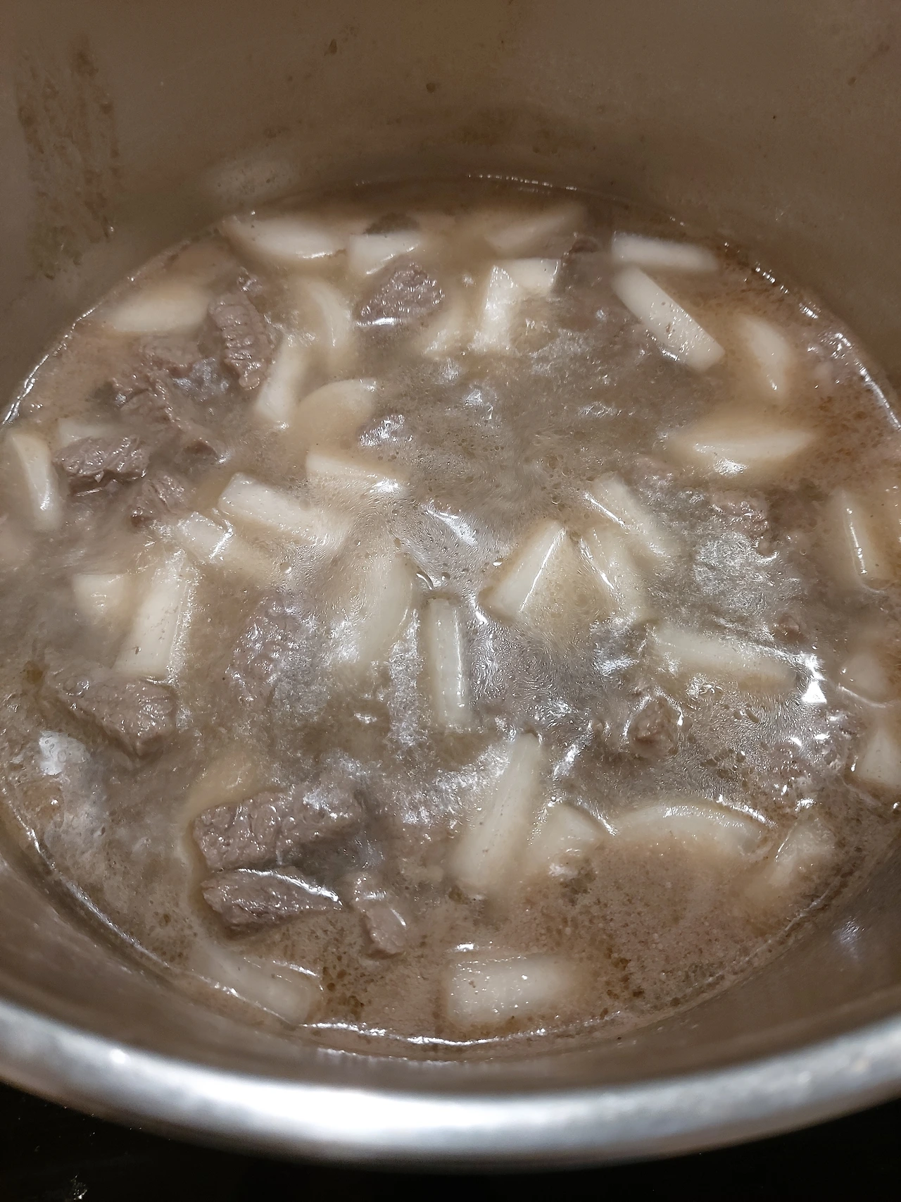 살짝 볶은 고기에 십자 모양으로 썬 무를 넣고 물을 잠길만큼만 부어 무를 포옥 익힌다.