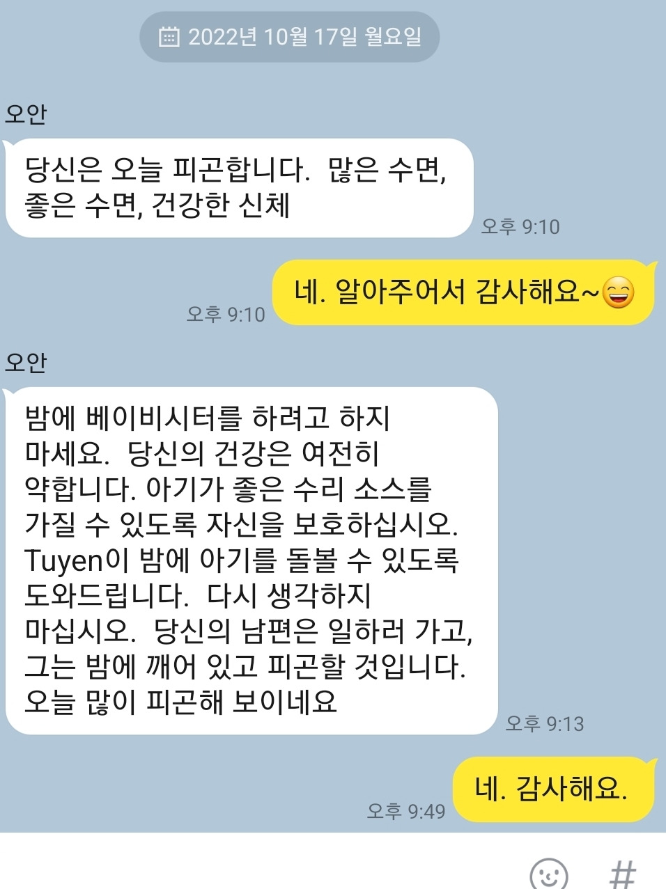 얼른 베트남어도 익숙해지고 야간 이모의 색다른 육아방식에도 길들여지기를 바랄 뿐이다.