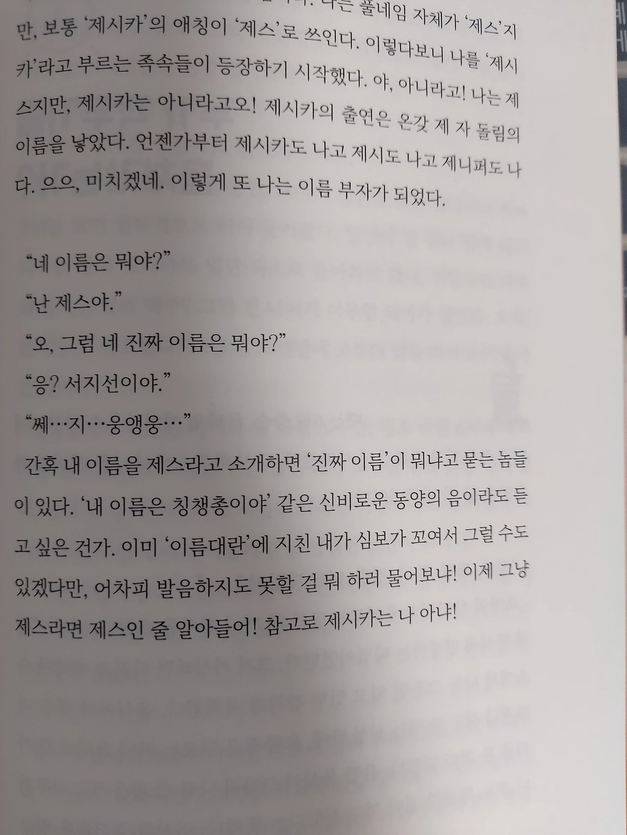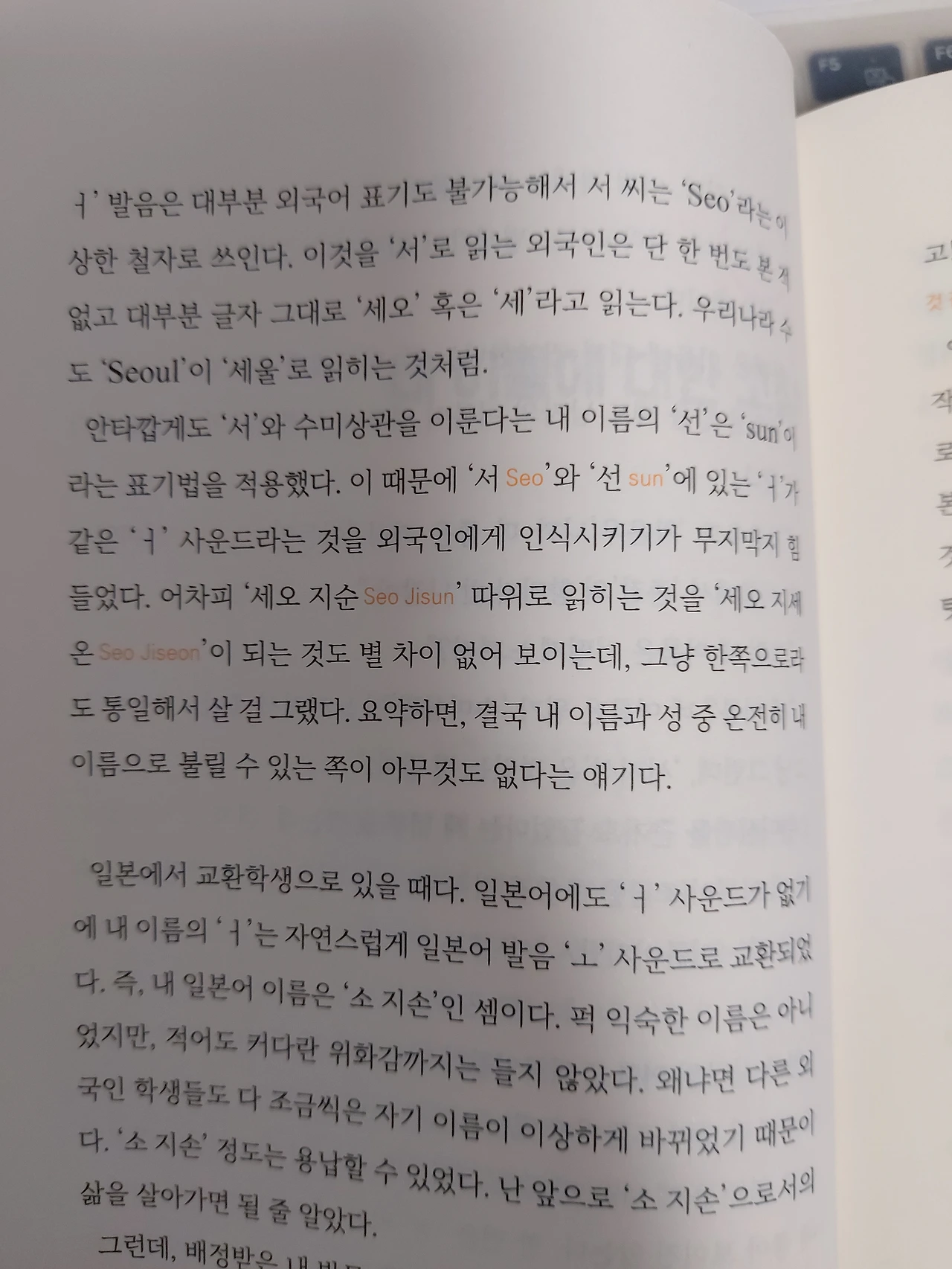 p.82 내 이름에 대한 고찰 내 이름 서지선. 외국어 표기할 때 ‘서‘를 Seo로 쓴다. 그럼 ‘세오’ 혹은 ‘세’로 읽는다. “쎄오 지 쑨”