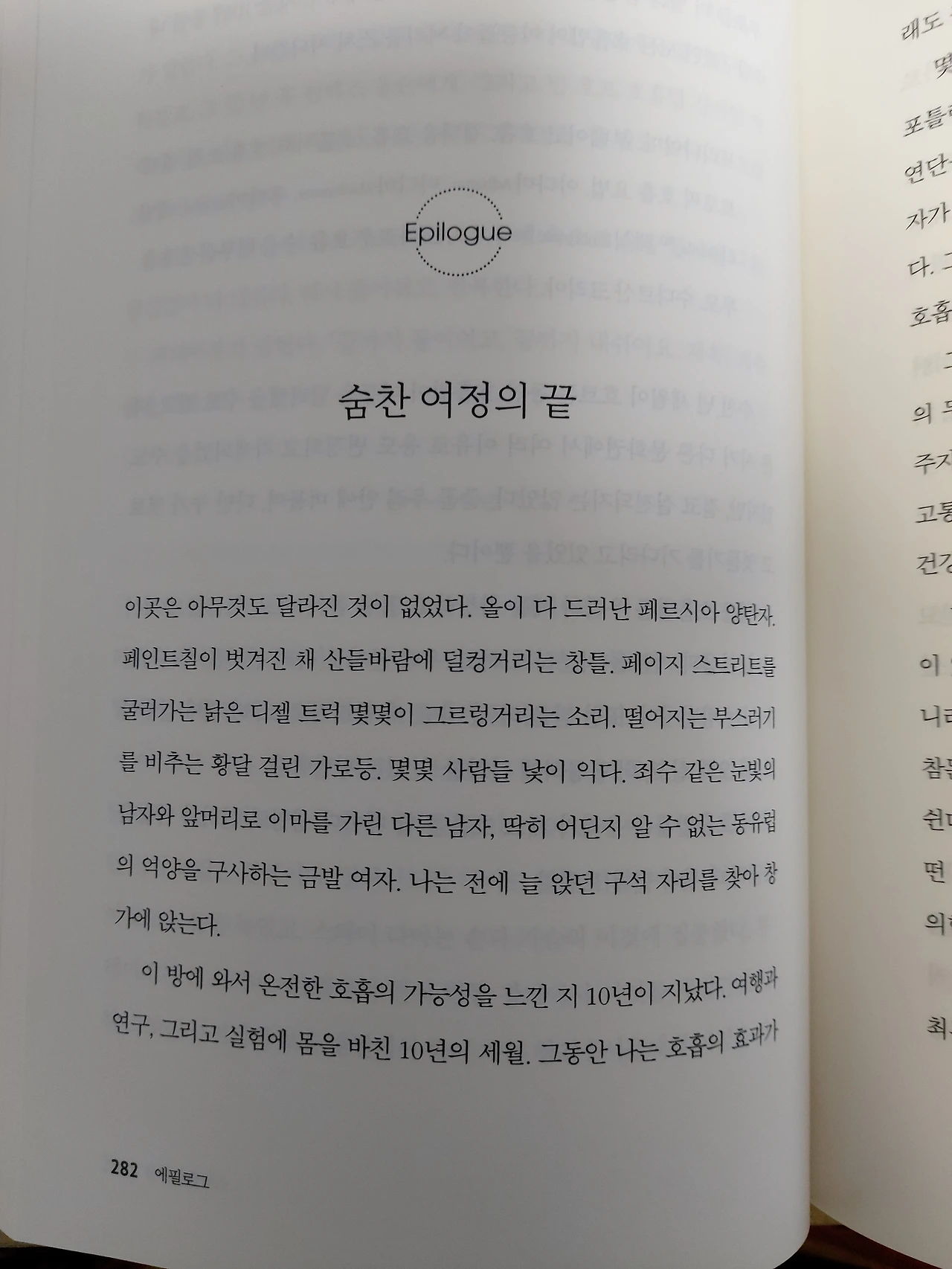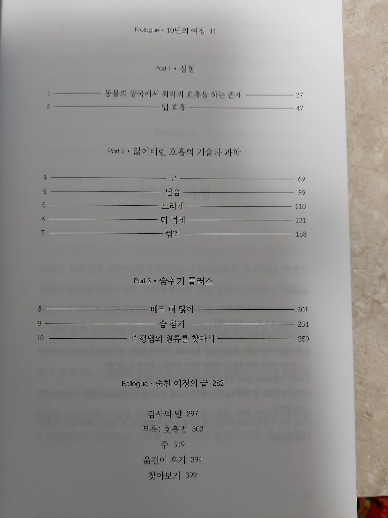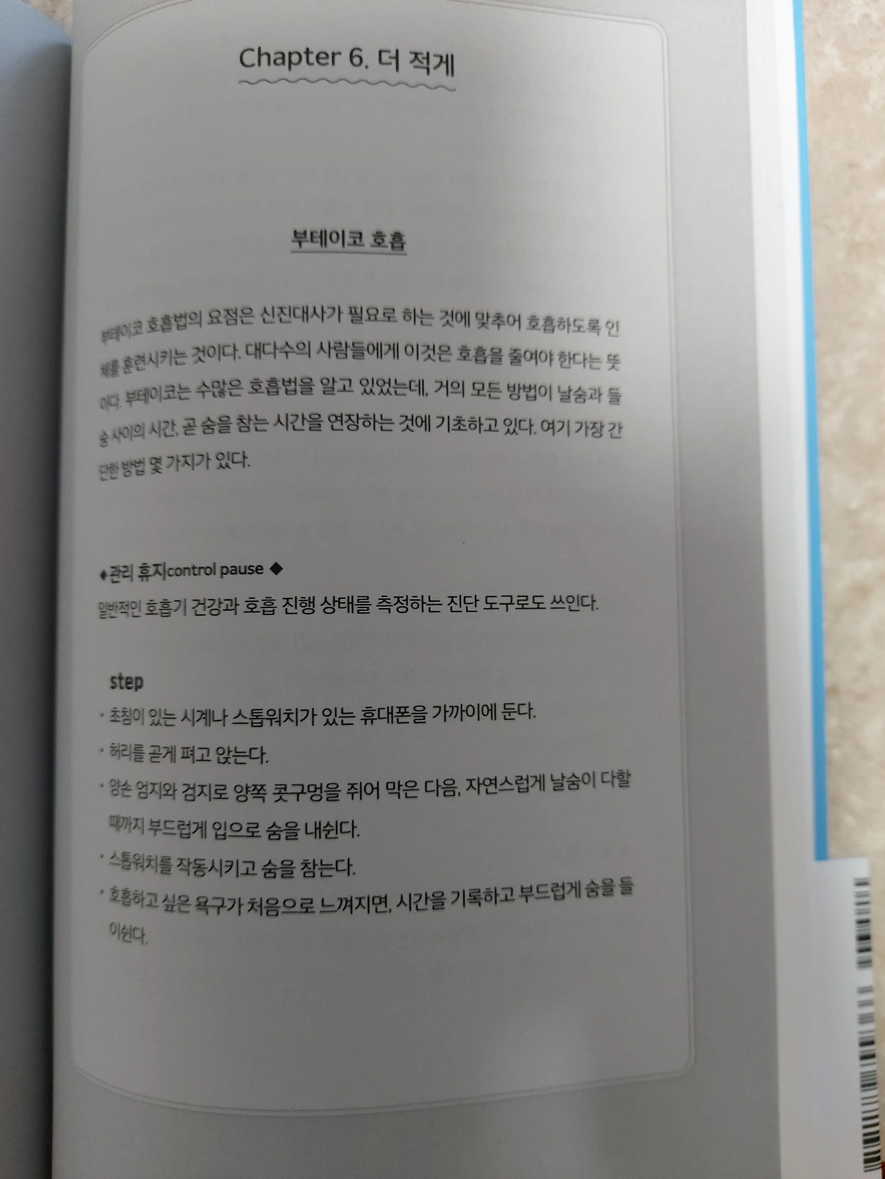 p.294 지난 모든 여행과 고행을 통해 내가 믿게 된 하나의 교훈, 하나의 등식이 있는데, 그것은 바로 건강과 행복의 장수의 근원은 숨쉬기라는 것이다. 이것을 알아내는데 10년이 걸렸다. 완벽한 호흡은 이런 것이다. 약 5.5초 동안 숨을 들이쉬고 , 5.5초 동안 내쉰다. 1분 동안 5.5회 호흡을 하며 모두 약 5.5리터의 공기를 호흡한다.