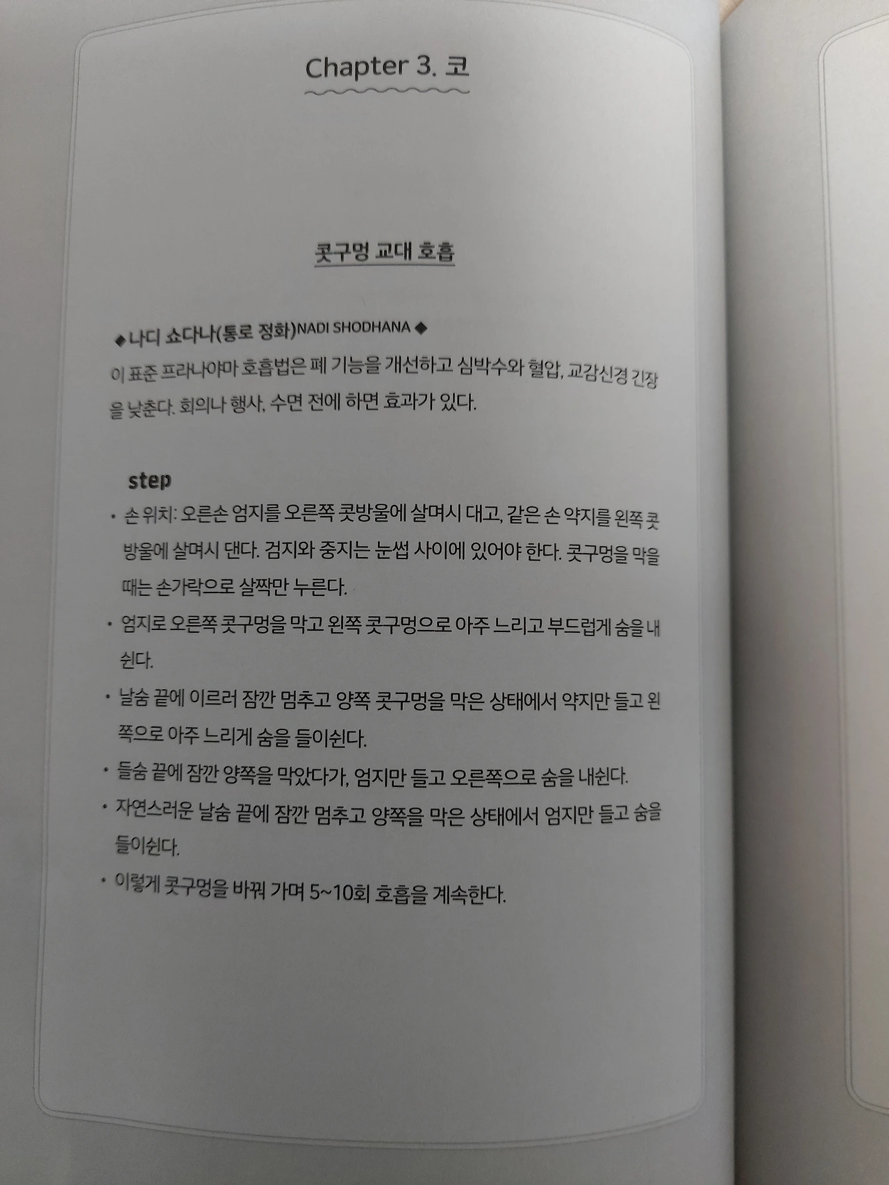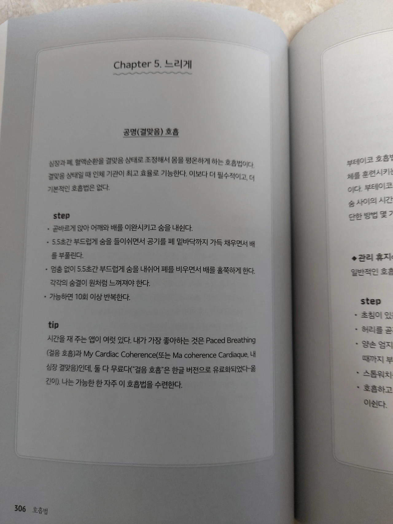 p.318 앤드루 웨일 박사가 널리 알린 이 호흡법은 몸을 깊은 이완상태로 유도한다. 나는 특히 장거리 비행을 할 때 이 호흡법으로 잠을 청한다.