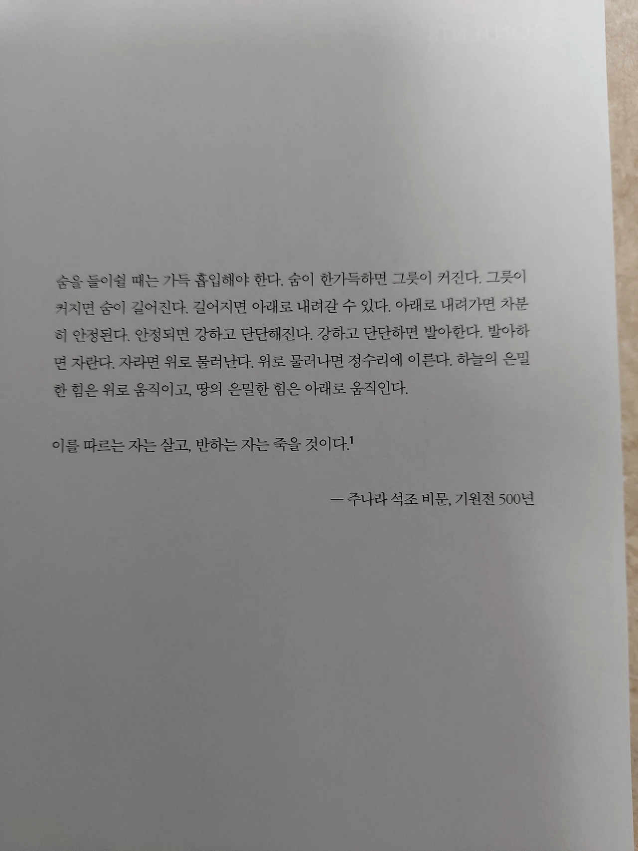 책 속으로... 숨을 들이쉴 때는 가득 흡입해야 한다. 숨이 한가득하면 그릇이 커진다. 그릇이 커지면 숨이 길어진다. 길어지면 아래로 내려갈 수 있다. 아래로 내려가면 차분히 안정된다. 안정되면 강하고 단단해진다. 강하고 단단하면 발아한다. 발아하면 자란다. 자라면 위로 물러난다. 위로 물러나면 정수리에 이른다. 하늘의 은밀한 힘은 위로 움직이고, 땅의 은밀한 힘은 아래로 움직인다. 이를 따르는 자는 살고, 반하는 자는 죽을 것이다! -주나라 석조 비문, 기원전 500년