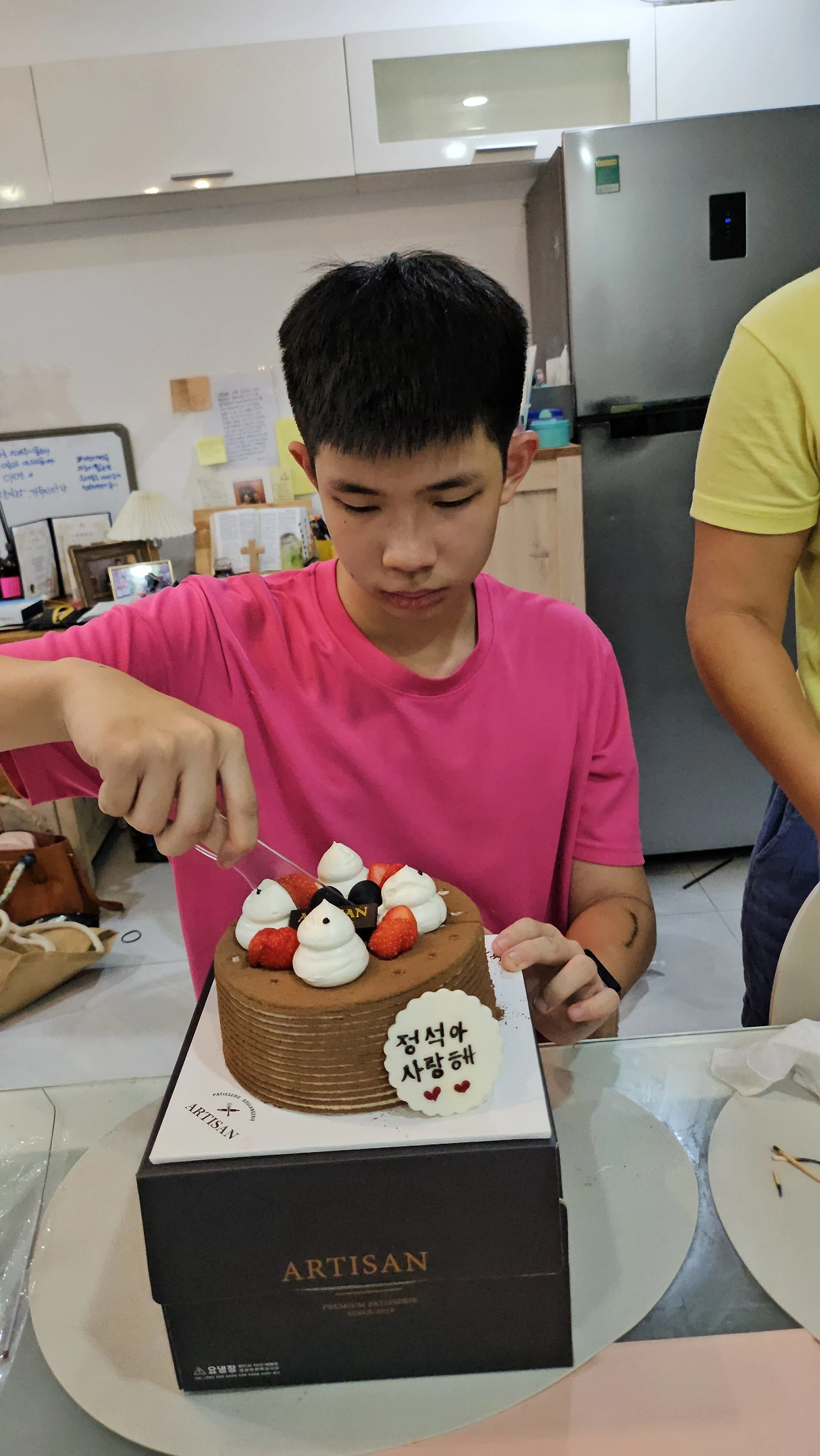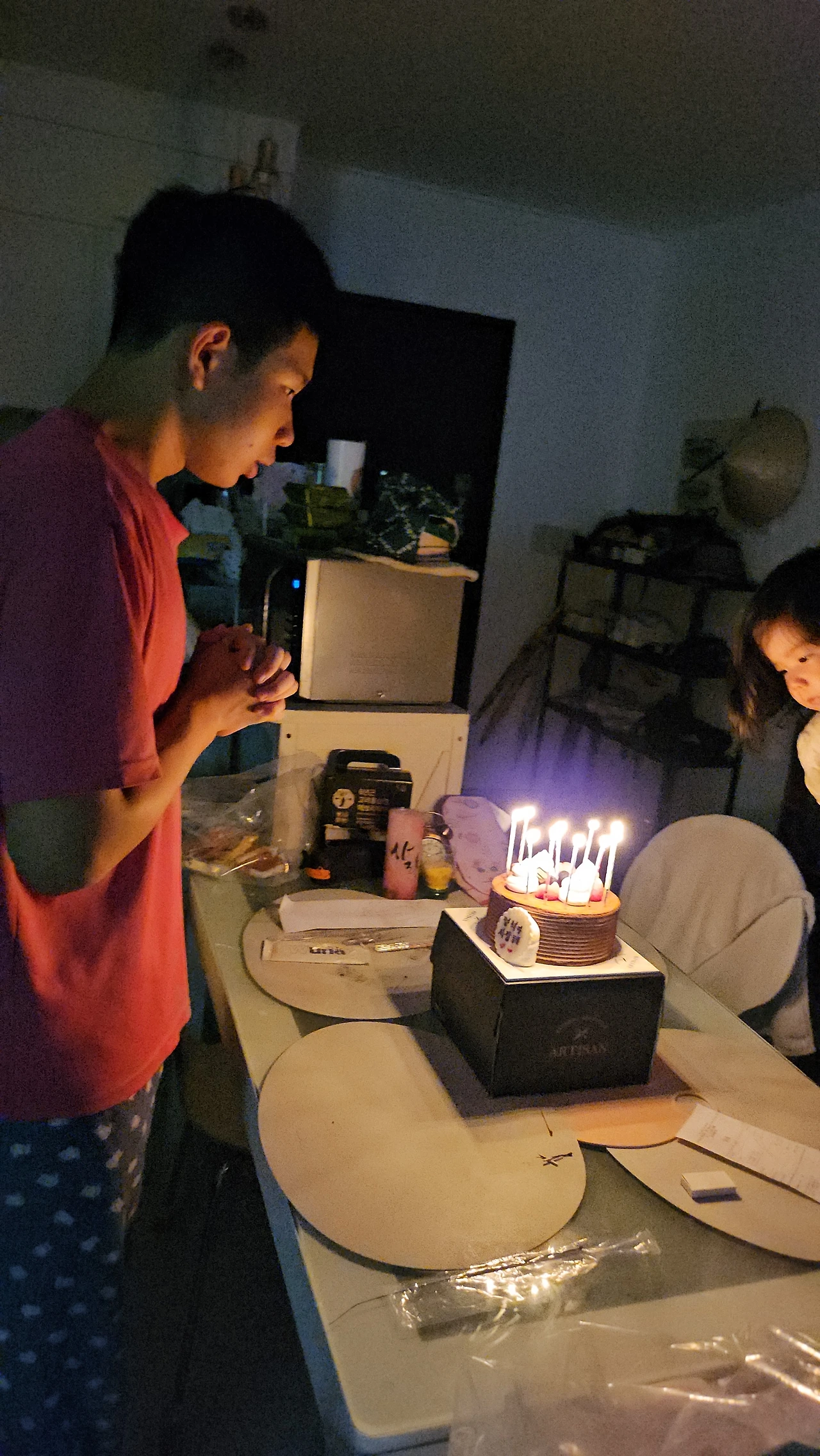 어찌어찌하여 불을 끄고 축하노래를 부른 후 아들과 딸은 사이좋게 촛불을 함께 불어 꺼뜨렸다.